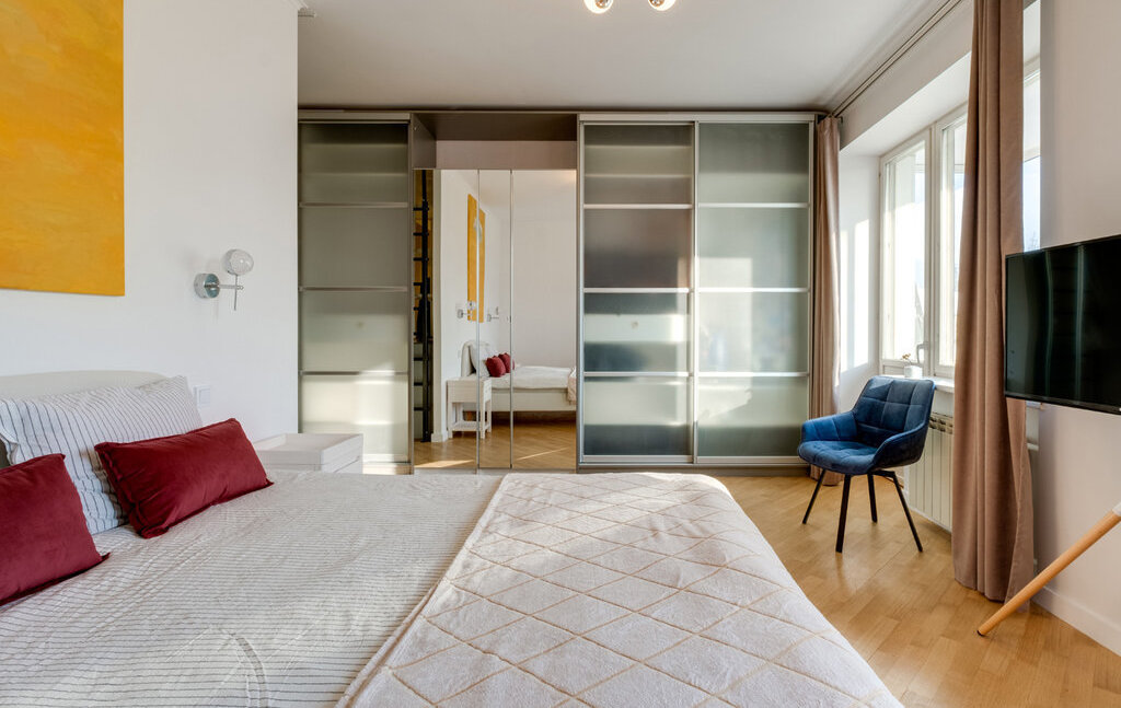 Площадь квартиры — 98 м². Планировка продумана до мелочей: две изолированные комнаты, просторный холл, спальня с отдельной гардеробной и балконом.