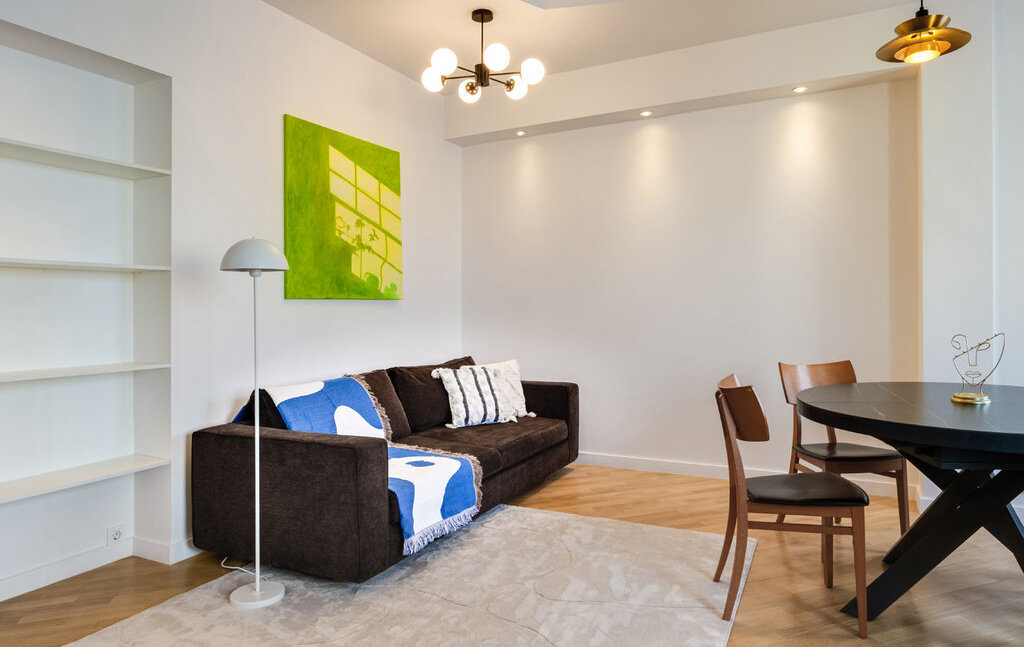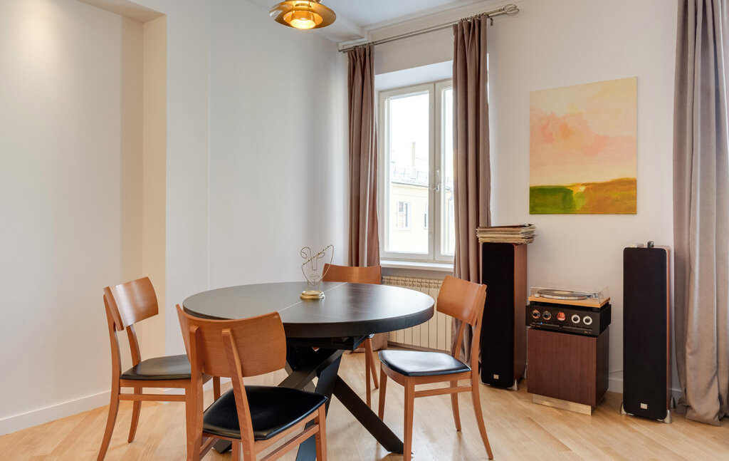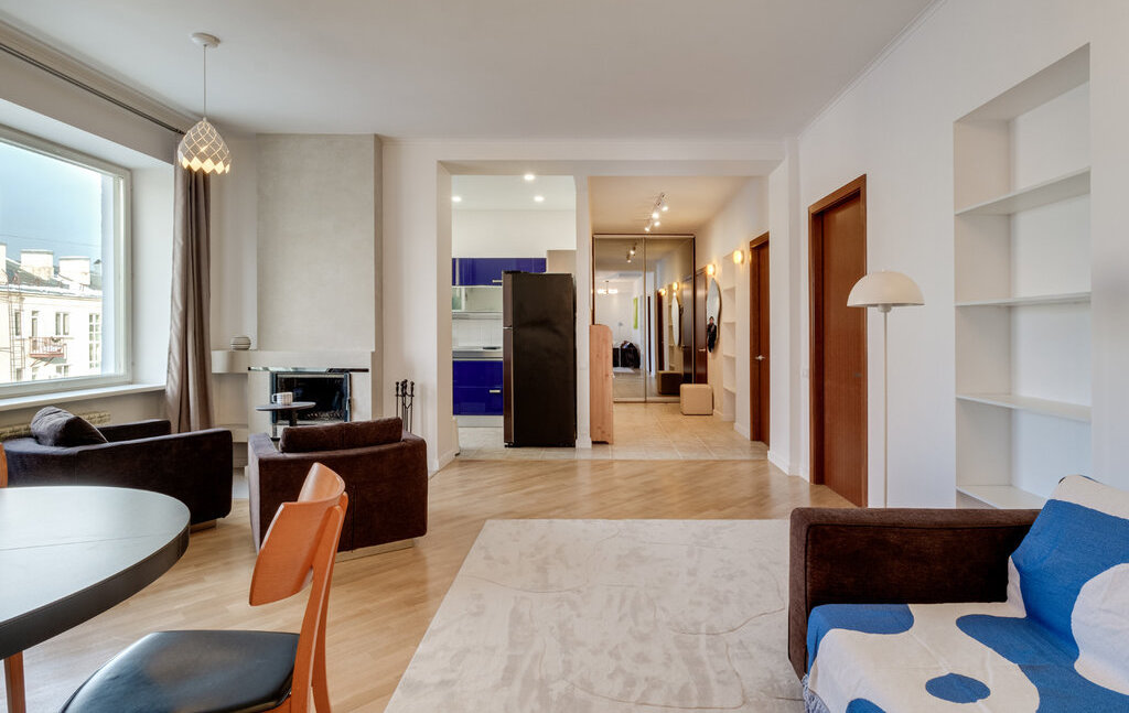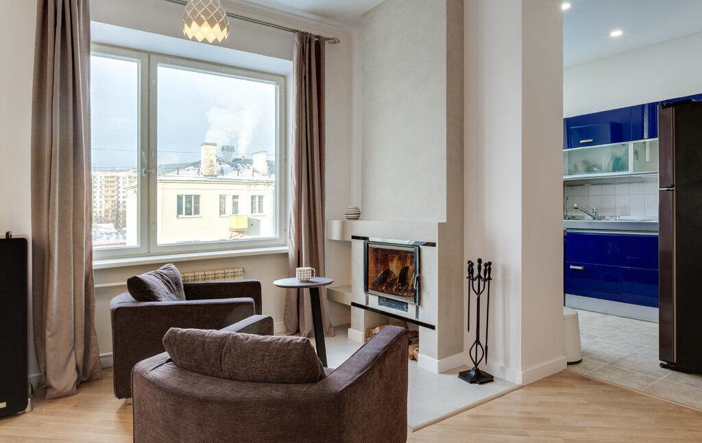 Центральным элементом гостиной является действующий камин, создающий особую атмосферу уюта и статуса — исключительное преимущество для аренды в центре города.