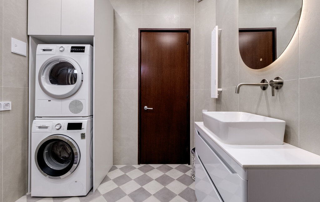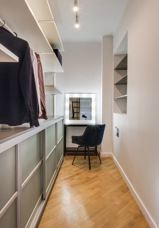 Полностью укомплектована всей необходимой техникой: кондиционеры, стиральная и сушильная машины, посудомоечная машина, водонагреватель. Много продуманных систем хранения.