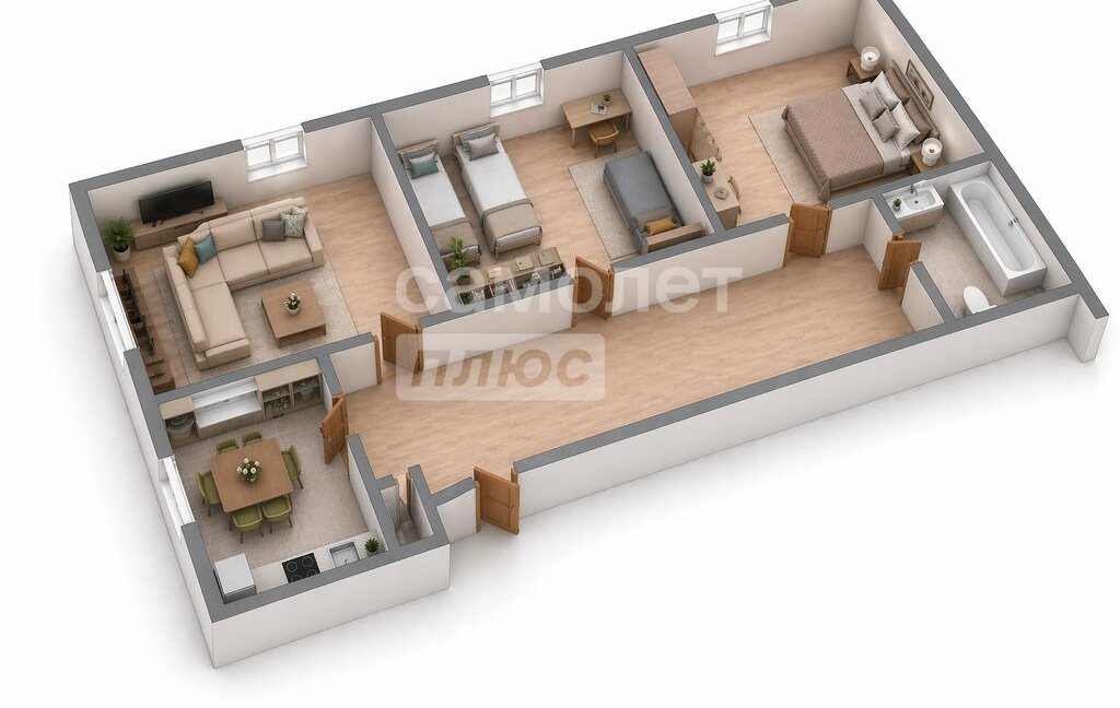 изолированные комнаты, функциональная кухня, два санузла и лоджия. Пространство наполнено светом, интерьер выполнен в спокойной, актуальной гамме с качественными материалами и новой мебелью.
