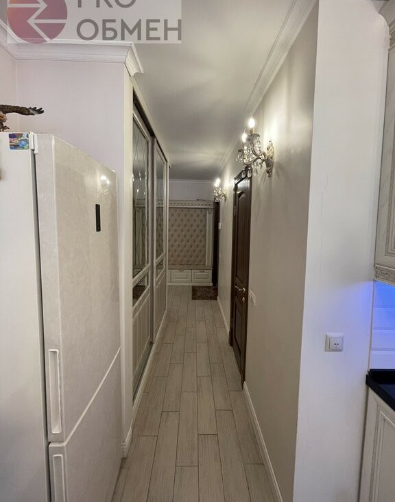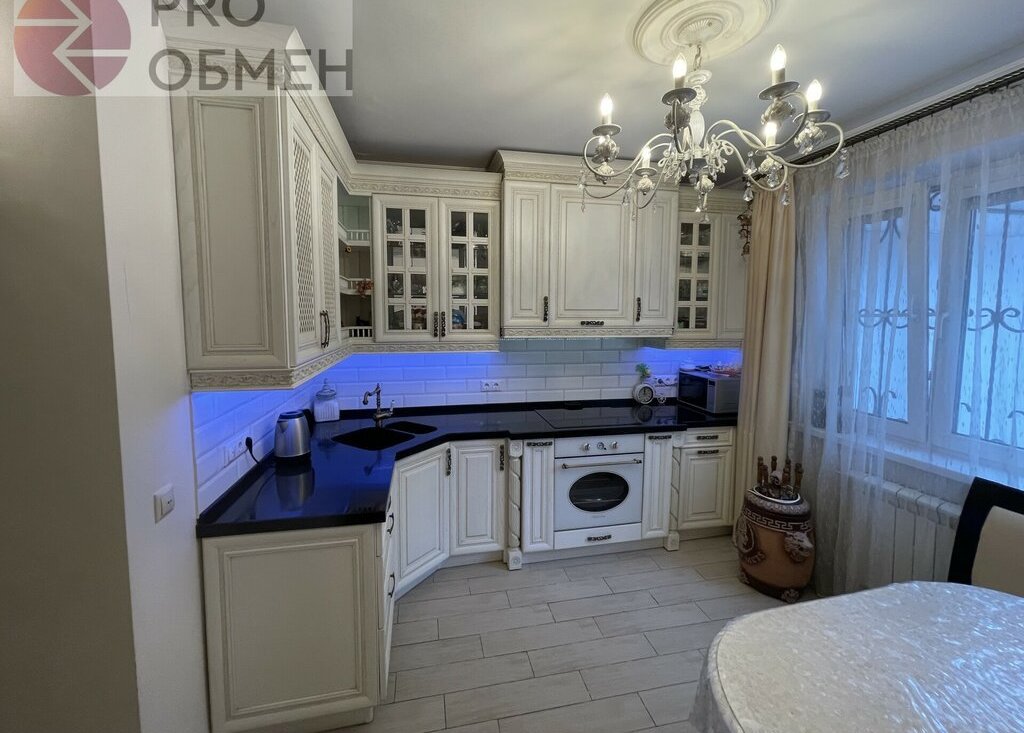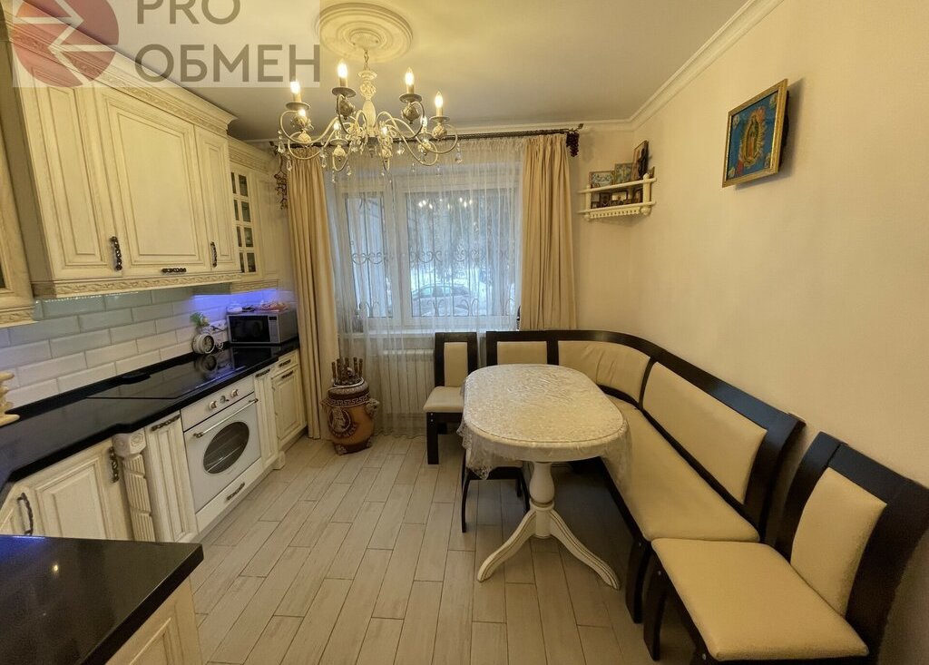 Кухня: 10.3 кв.м. Встроенный гарнитур в тёплых натуральных оттенках с интегрированной техникой: электрическая варочная панель, электрический духовой шкаф, двухкамерный холодильник, микроволновая печь, каменная столешница. Уютная обеденная зона с мягким угловым комплектом – это идеальное место для семейных встреч.