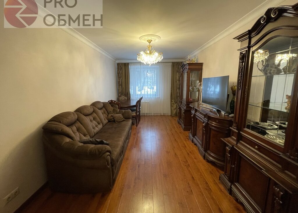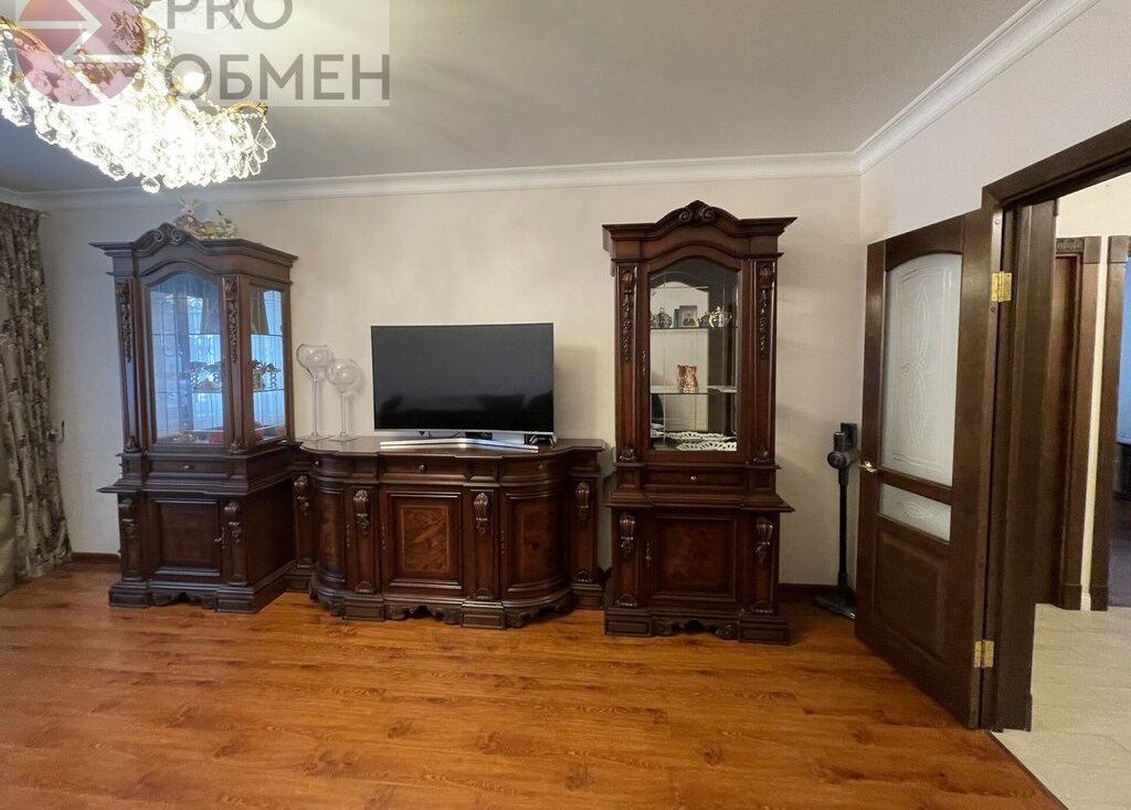 Гостиная: 18,0 кв.м. Большое пространство для отдыха и приёма гостей. Раскладывающийся диван, зона TV, дизайнерский комод и стеклянные витрины. Деревянный пол тёплого оттенка и мягкий текстиль создают ощущение уюта и камерности.