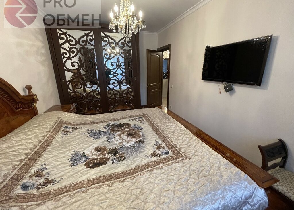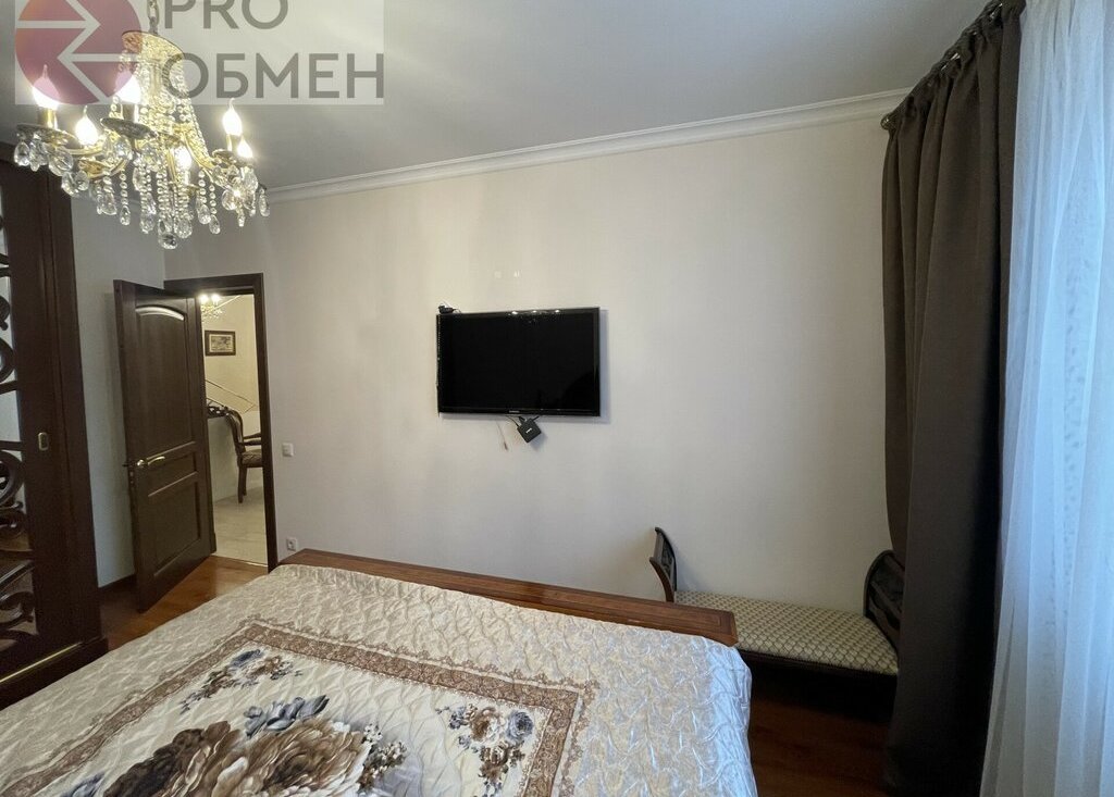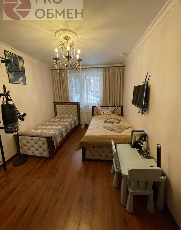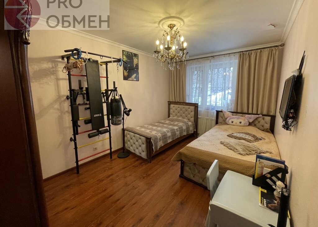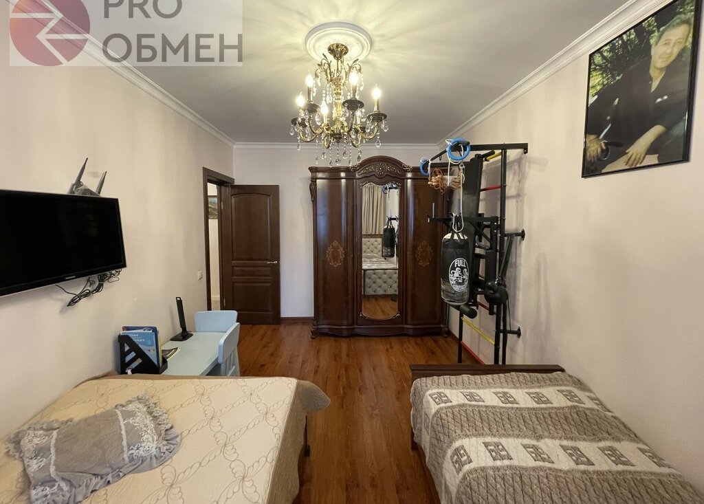 Детская: 14,0 кв.м. Две кровати с ортопедическим матрасом, спортивный уголок, телевизор. Шкаф для одежды. Во всех комнатах висят роскошные люстры.