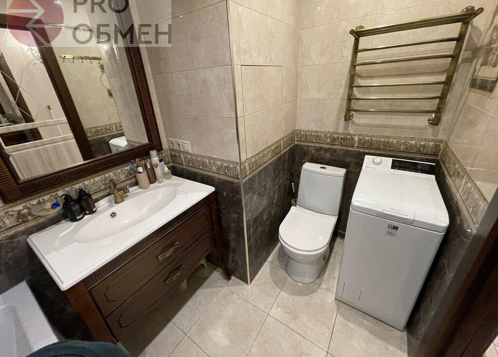 Санузел совмещенный импортная сантехника и европейская отделка. Ванна, раковина с тумбой, зеркало с подсветкой, стиральная машина вертикальной загрузки.