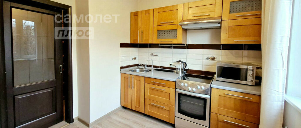 Присутствует необходимая бытовая техника: современная плита, микроволновка, вытяжка, холодильник.