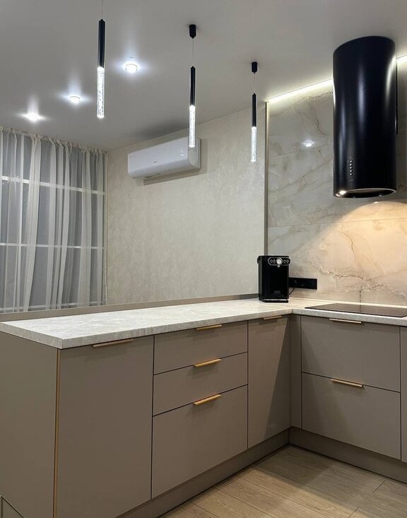 В кухне есть все необходимое: большая посудомоечная машина, духовка с функцией микроволновой печи, варочная панель, большой холодильник, чайник, установлена система фильтрации воды и дополнительный питьевой кран, вытяжка, кухонный фартук изготовлен из керамогранита, большая зона хранения посуды и продуктов.