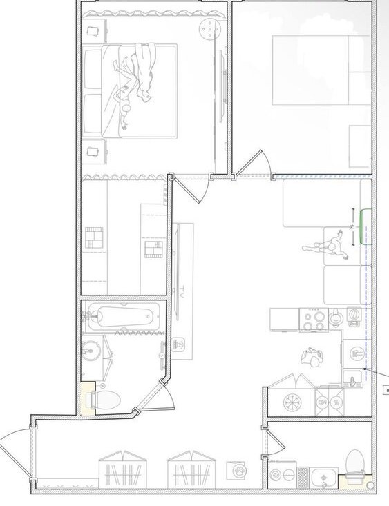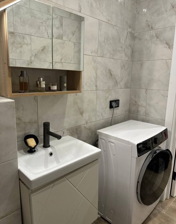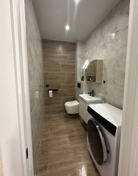 - 2 санузла (в первом размещается ванна, туалет с инсталляцией, гигиенический душ, раковина с тумбой.; во втором дополнительный туалет с инсталляцией, стиральная машина, раковина с тумбой).