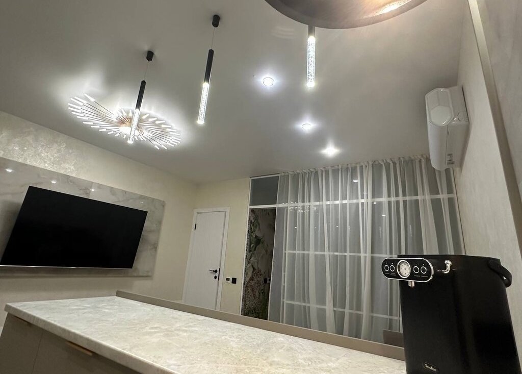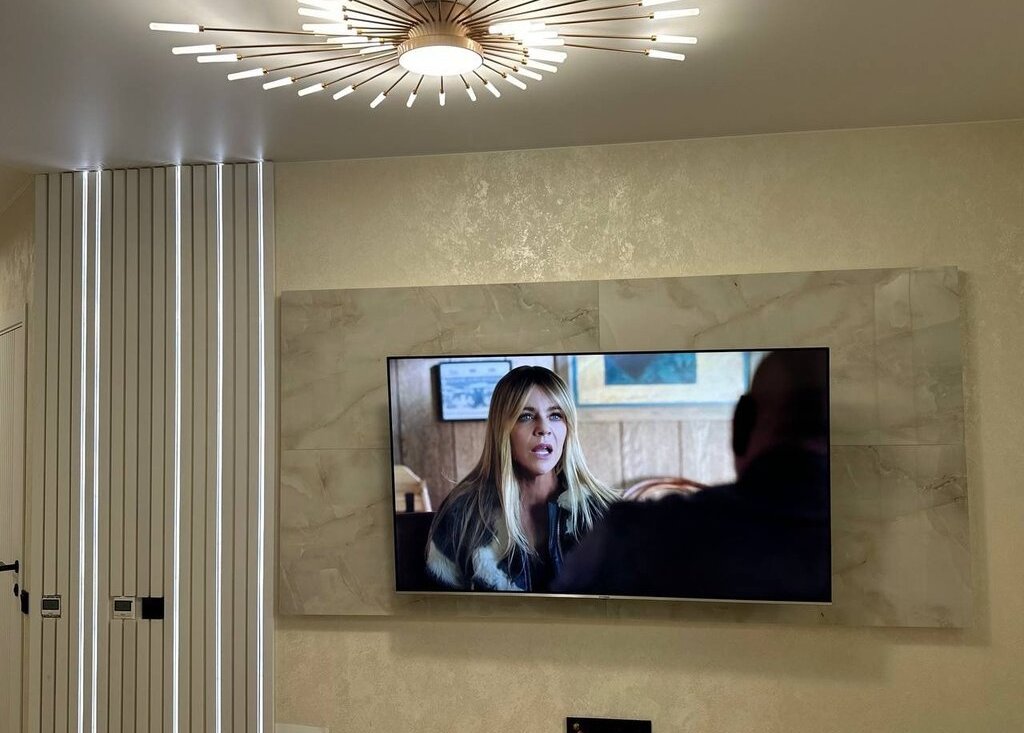 В гостинной: большой диван, телевизор (65 дюймов), стеновые панели с подсветкой, работающей в разных режимах, телевизор закреплен на пано из керамогранита, стол, стулья, кондиционер.