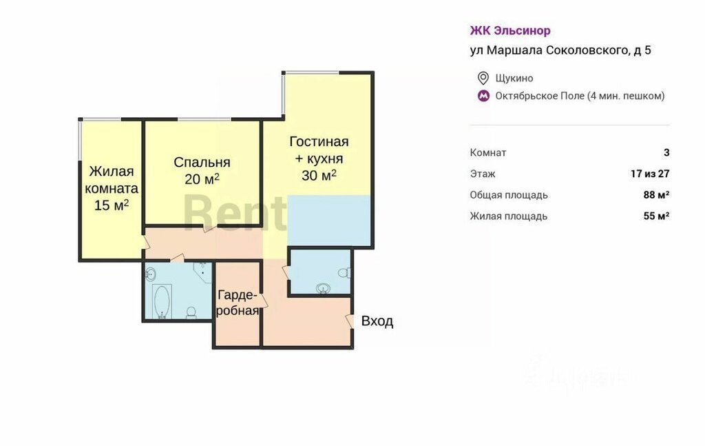🔹 Аренда квартиры 88 м² в ЖК бизнес-класса «Эльсинор», м. Октябрьское Поле