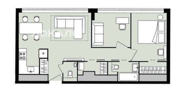 Планировка: 2 комнаты + гостиная с кухней, гардеробная, кладовка, с/у c ванной, гостевой с/у