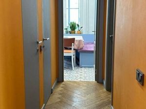 В доме грузовой лифт, на 1-м этаже есть пандус для колясок и подъемник для инвалидов. Чистый подъезд, консьерж, домофон в каждой квартире. на этаже просторный тамбур на 4 квартиры. Приличные, тихие соседи.