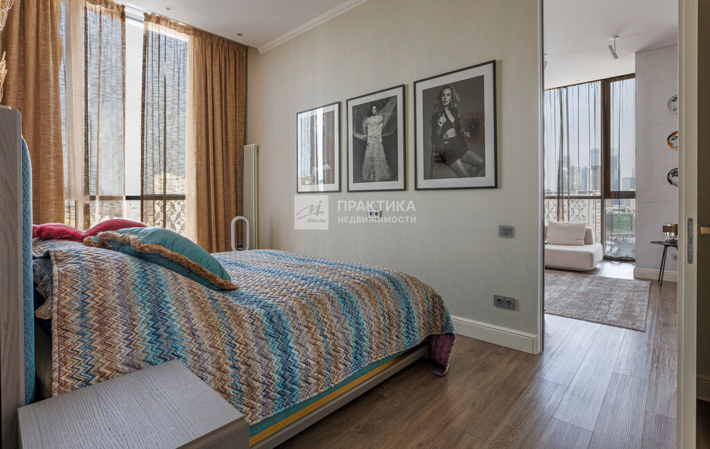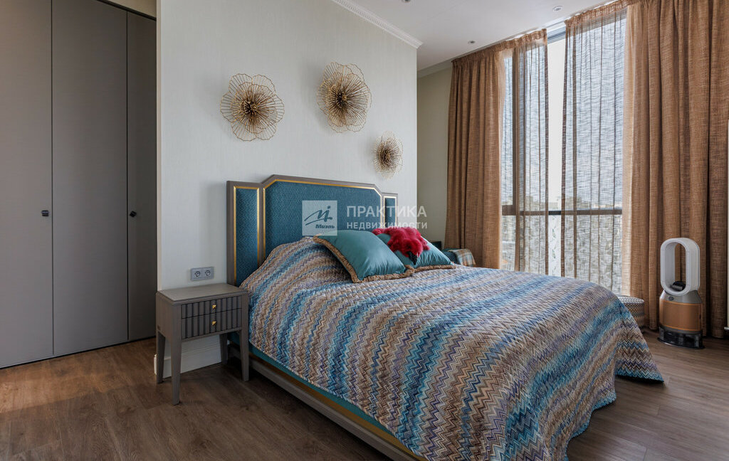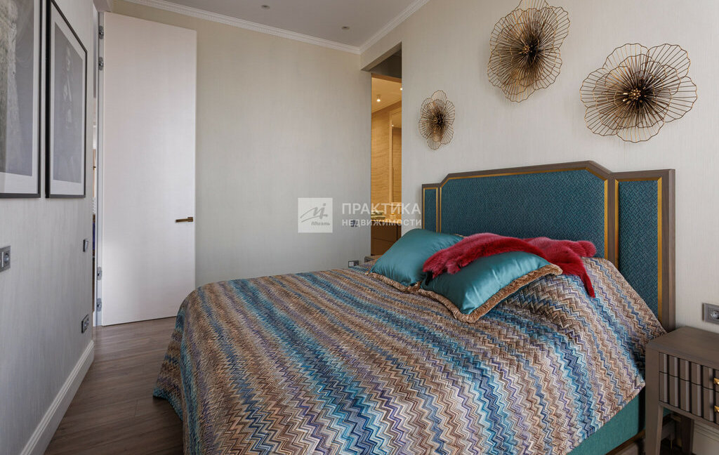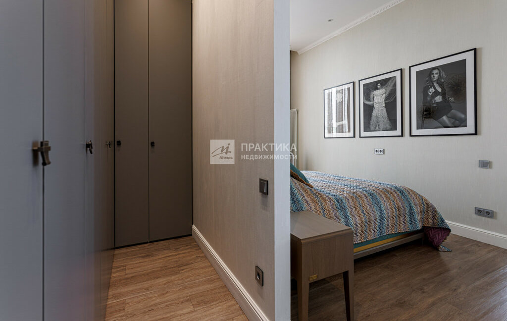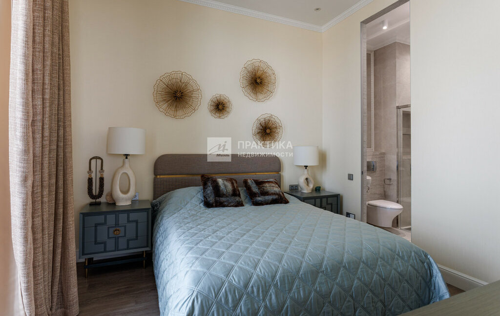 Мастер спальня с большой кроватью , гардеробной и ванной комнатой .