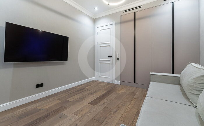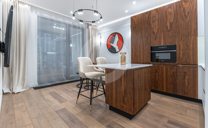 Вся мебель выполнена по индивидуальному заказу от ведущих производителей. Кухня со всей бытовой техникой (Bosch, Haier). Сантехника (Италия, Германия-Boheme,Villeroy&Boch). Пол инженерная доска (Швеция) и керамогранит c теплым полом.