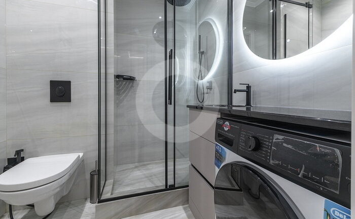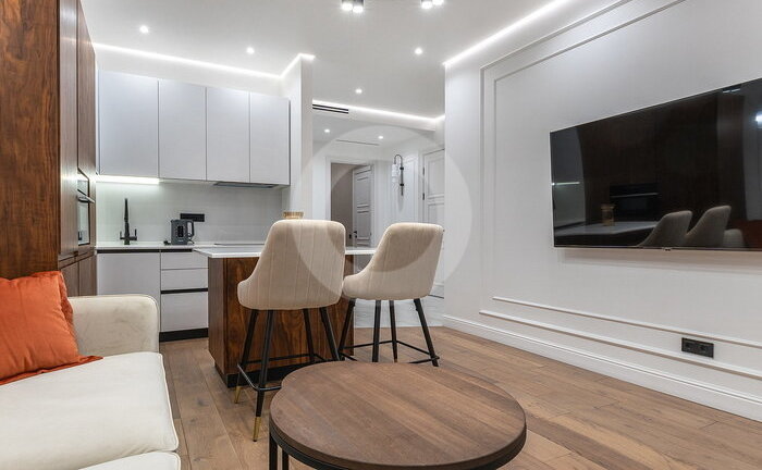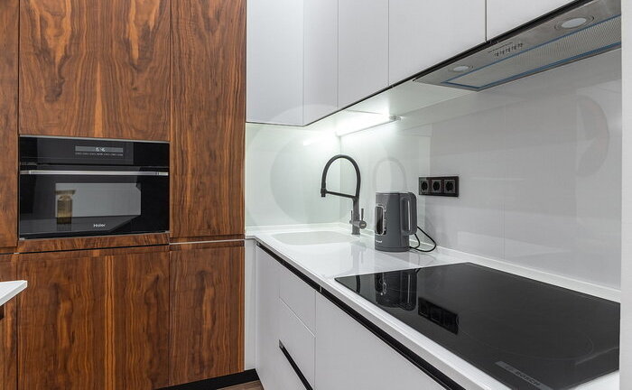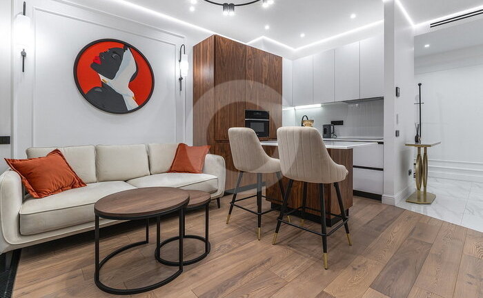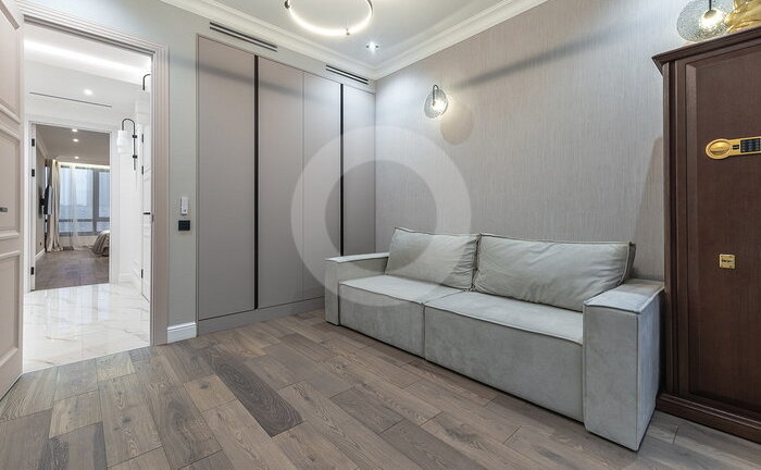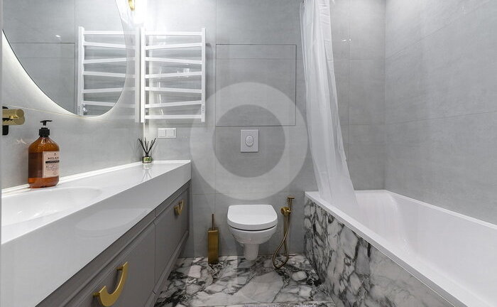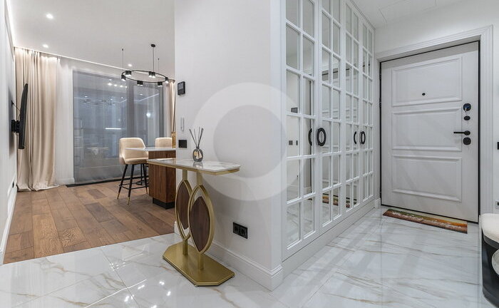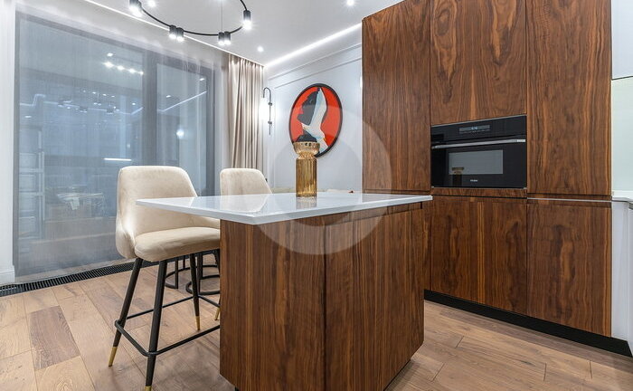 Вся мебель выполнена по индивидуальному заказу от ведущих производителей. Кухня со всей бытовой техникой (Bosch, Haier). Сантехника (Италия, Германия-Boheme,Villeroy&Boch). Пол инженерная доска (Швеция) и керамогранит c теплым полом.