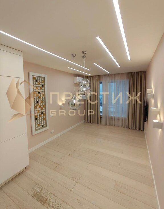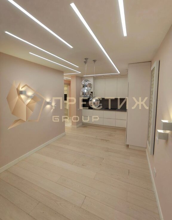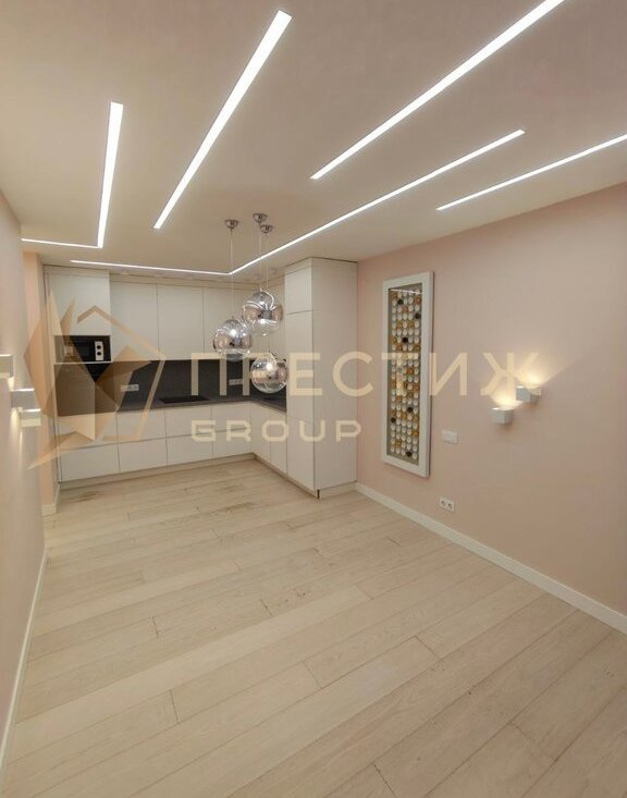 Большая просторная кухня-гостиная 20,8 м2, украшенная декоративной инсталляцией с видом во двор. Кухня 7.2 м2 с современным кухонным гарнитуром.