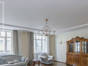 Квартира площадью 158 м² в комплексе "Дом на Покровском бульваре" на 8 этаже. Выполнен дизайнерский ремонт с использованием натурального дерева и камня. Интерьер выдержан в светло-бежевых и коричневых оттенках. На полу выложен керамогранит и паркетная доска. Стены и многоуровневые потолки декорированы деревянными вставками.
