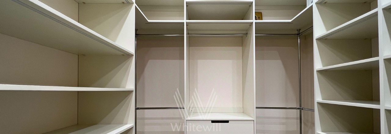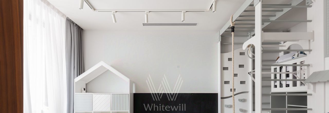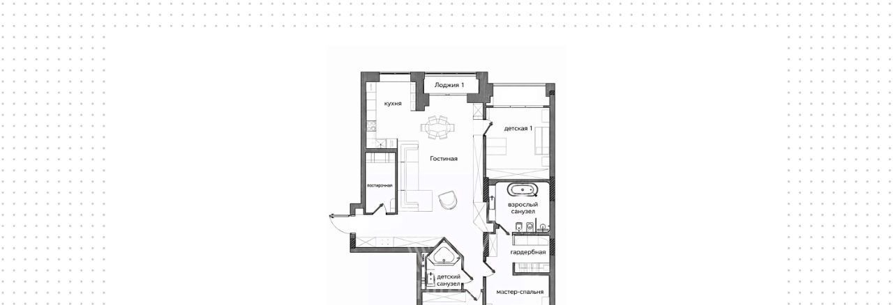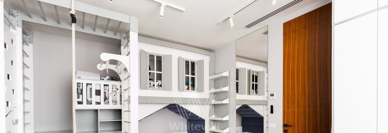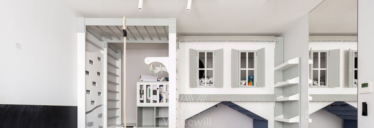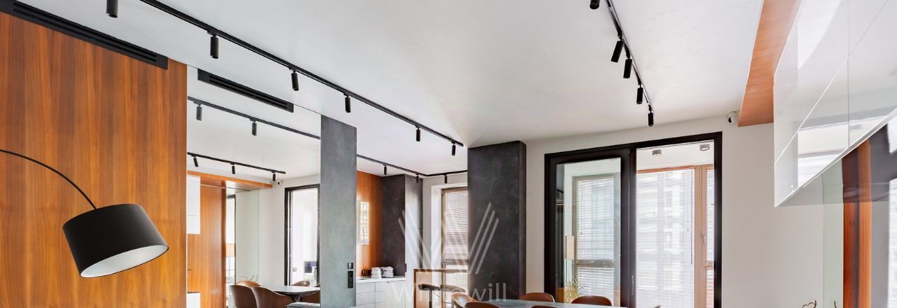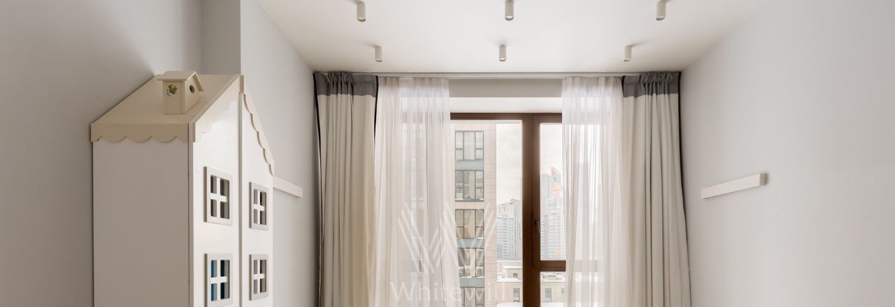 Спланирована кухня-гостиная с обеденной зоной, мастер-спальня с собственной ванной комнатой и гардеробной, 2 детские спальни, вторая ванная комната, гардеробная, постирочная, прихожая. Две утеплённые лоджии оборудованы под кабинеты. Квартира укомплектована итальянской мебелью Bonaldo, Boconcept, бытовой техникой Miele, Asko и сантехникой Villeroy & Boch. Установлены приточная вентиляция с подогревом, сплит-система кондиционирования, система защиты от протечек, тёплые полы с управлением по WiFi, сенсорные выключатели, шторы blackout с электроприводом в спальнях, мощные роутеры Kinetic. Предусмотрены 2 машино-места в подземном паркинге за дополнительную плату.