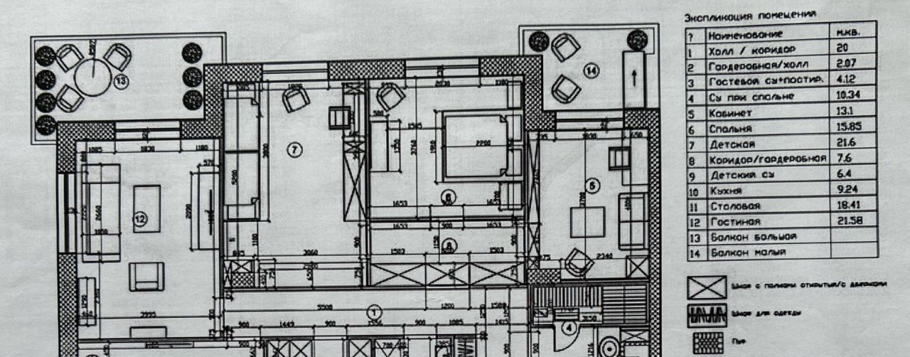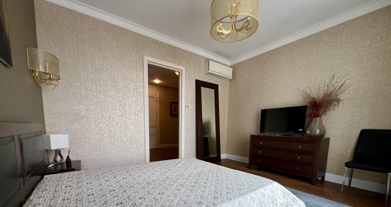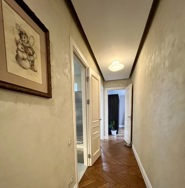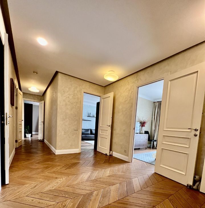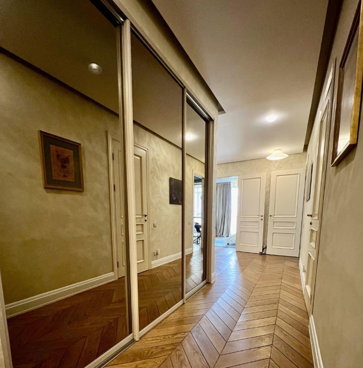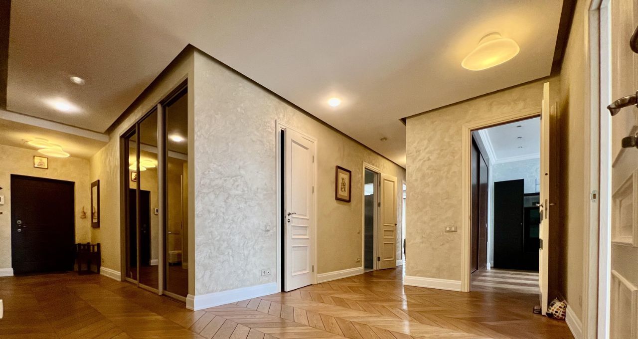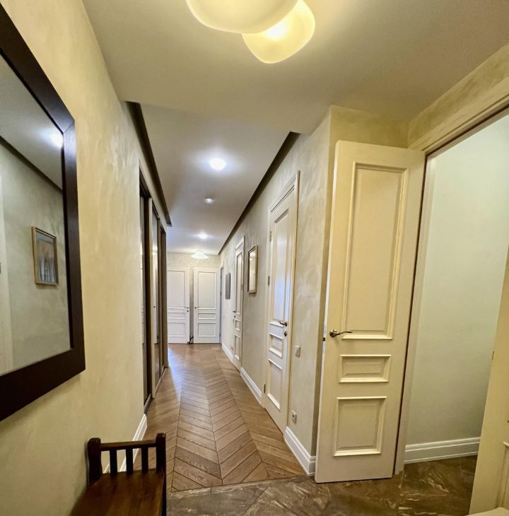 Квартира состоит из большого холла, коридора, гардеробной при входе, трех совмещенных санузлов (1. гостевой-прачечная, 2. хозяйский с встроенной сауной, 3. детский), кабинета, хозяйской спальни, детской, гостиной, столовой и кухни, а также двух теплых лоджий и 4-х французских балконов. Есть все необходимое для комфортного проживания. В квартире тихо и уютно.
