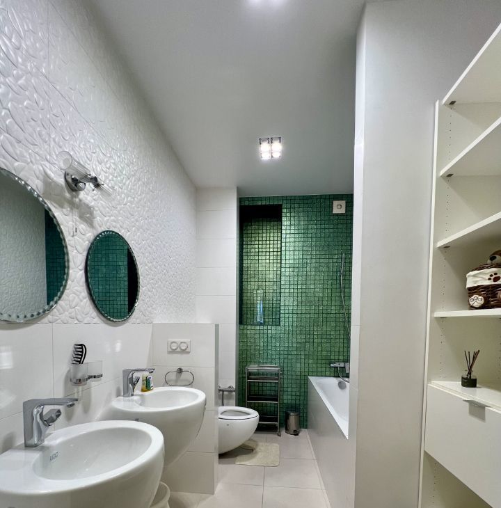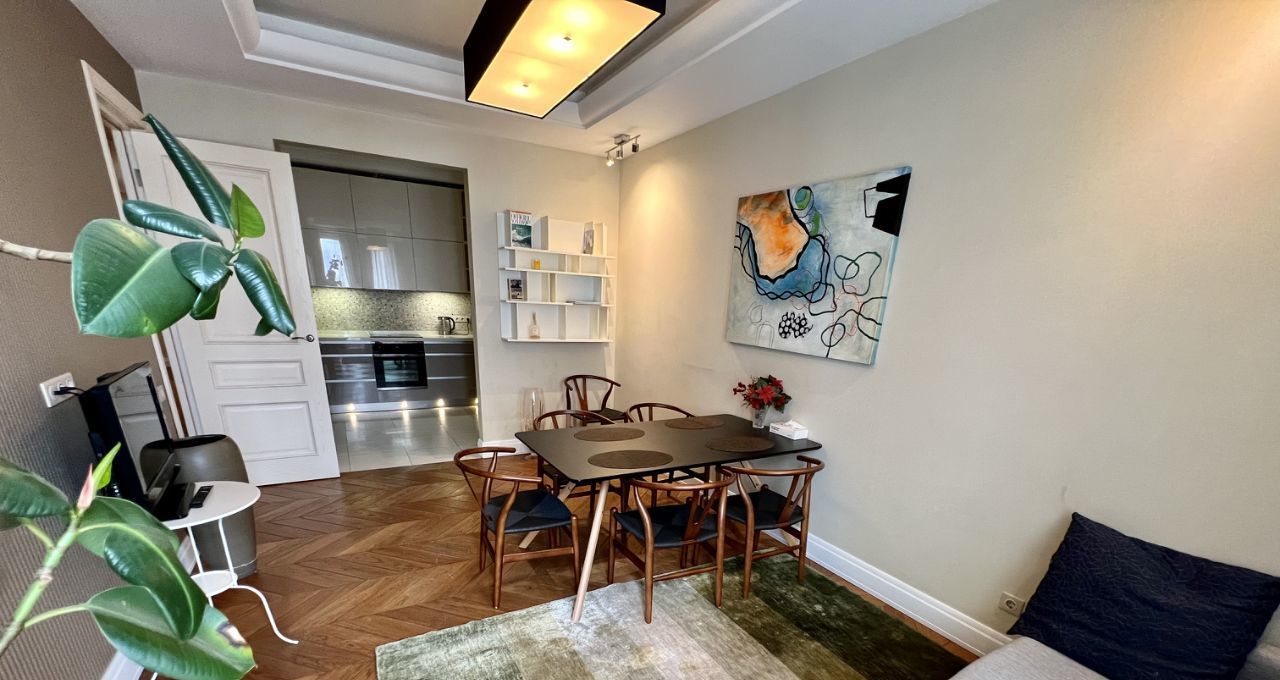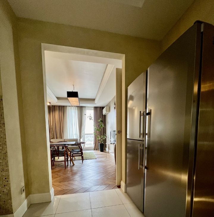 Общая площадь составляет 151 кв. м, жилая площадь — 72 кв. м, кухня — 10 кв. м+18 кв.м столовая. Квартира находится на 16 этаже 16-этажного монолитного дома, построенного в 2012 году. Высота потолков — 3 метра, что добавляет ощущение простора.