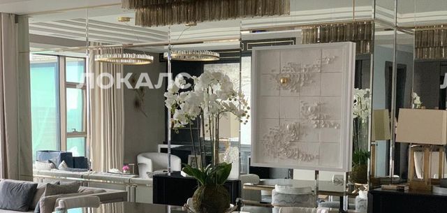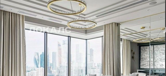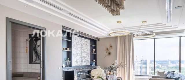 Кухня гостиная площадью 80 кв.м. с панорамными окнами на 2 стороны и видом на Москва Сити (невероятные виды). Кухня со всей встроенной техникой Miele, барный стол со стульями. В гостиной части - диван, фальш- камин из камня, огромный телевизор и проектор, большой обеденный стол.