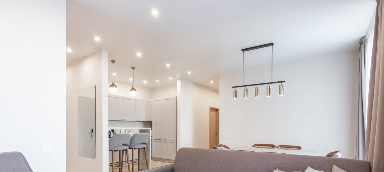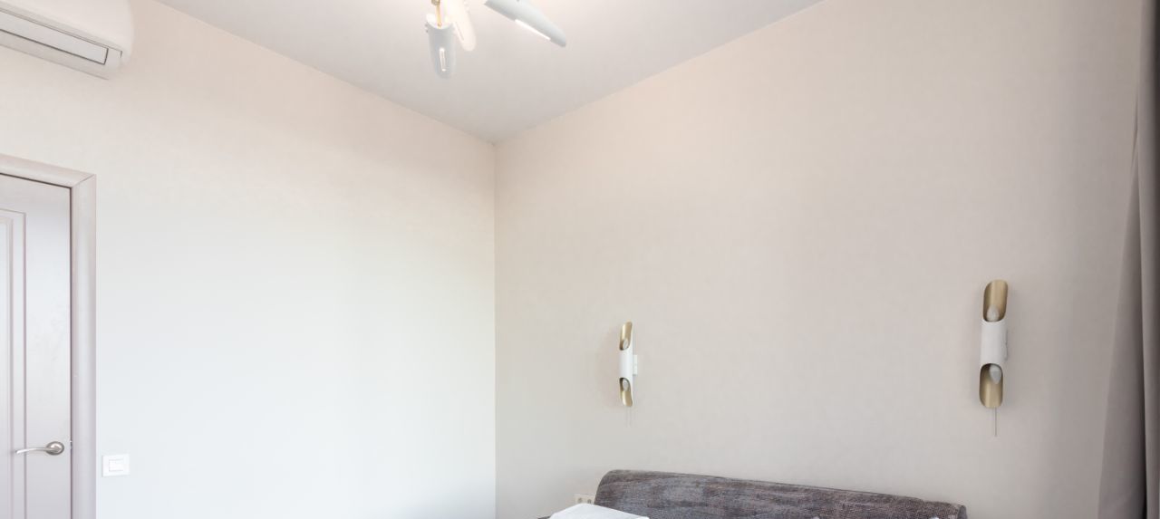 В квартире сделан современный евроремонт. Есть вся необходимая мебель на кухне и в комнате. Из техники: кондиционер, холодильник, телевизор, стиральная и посудомоечная машины. Планировка включает совмещённый и отдельный санузлы