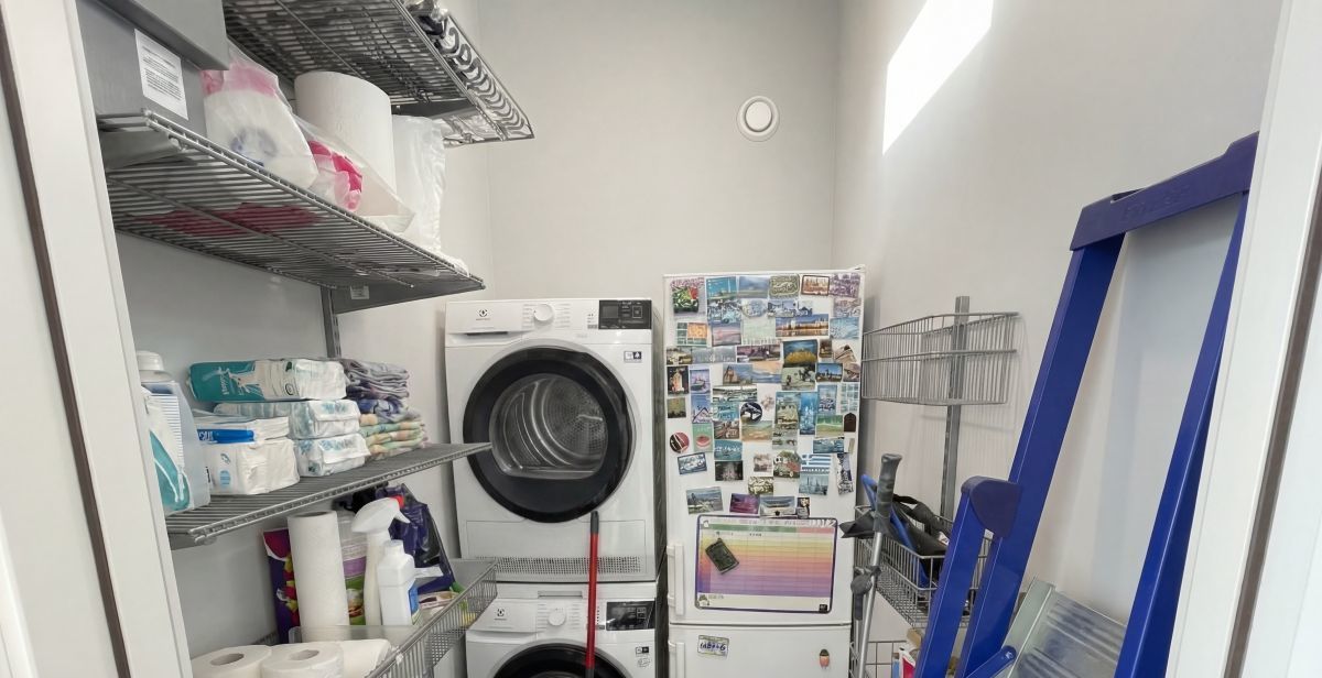 Кухня 18 м² укомплектована современной бытовой техникой: холодильник, плита, микроволновая печь, посудомоечная машина; также есть стиральная машина и сушилка.
