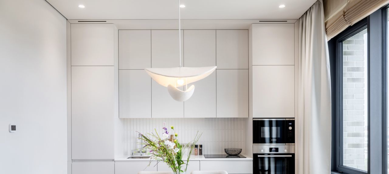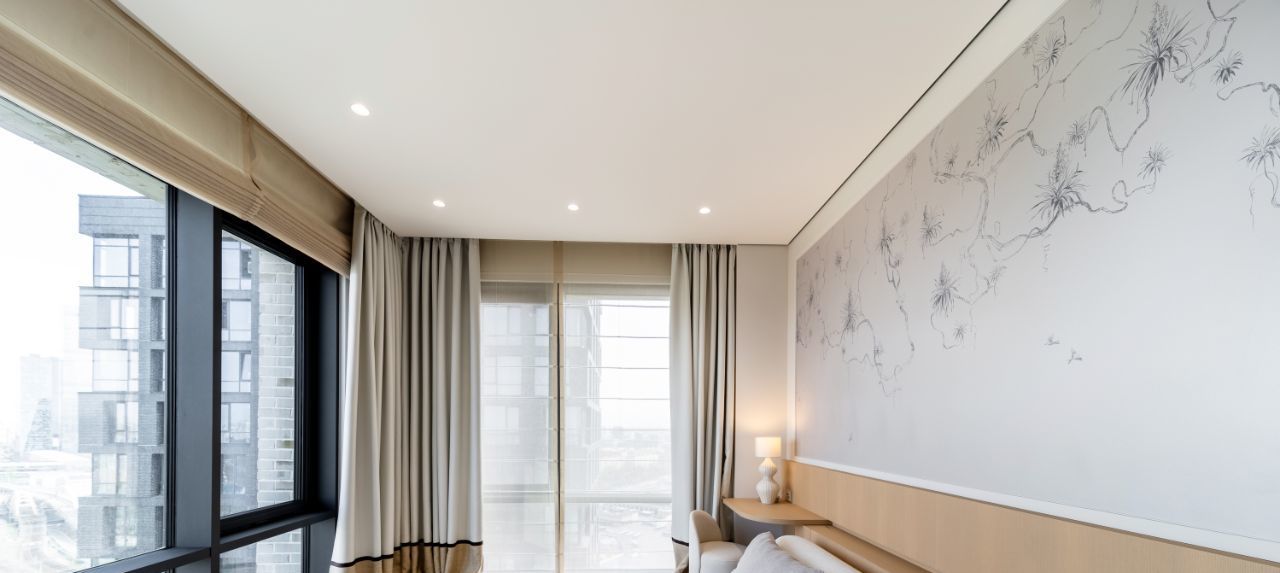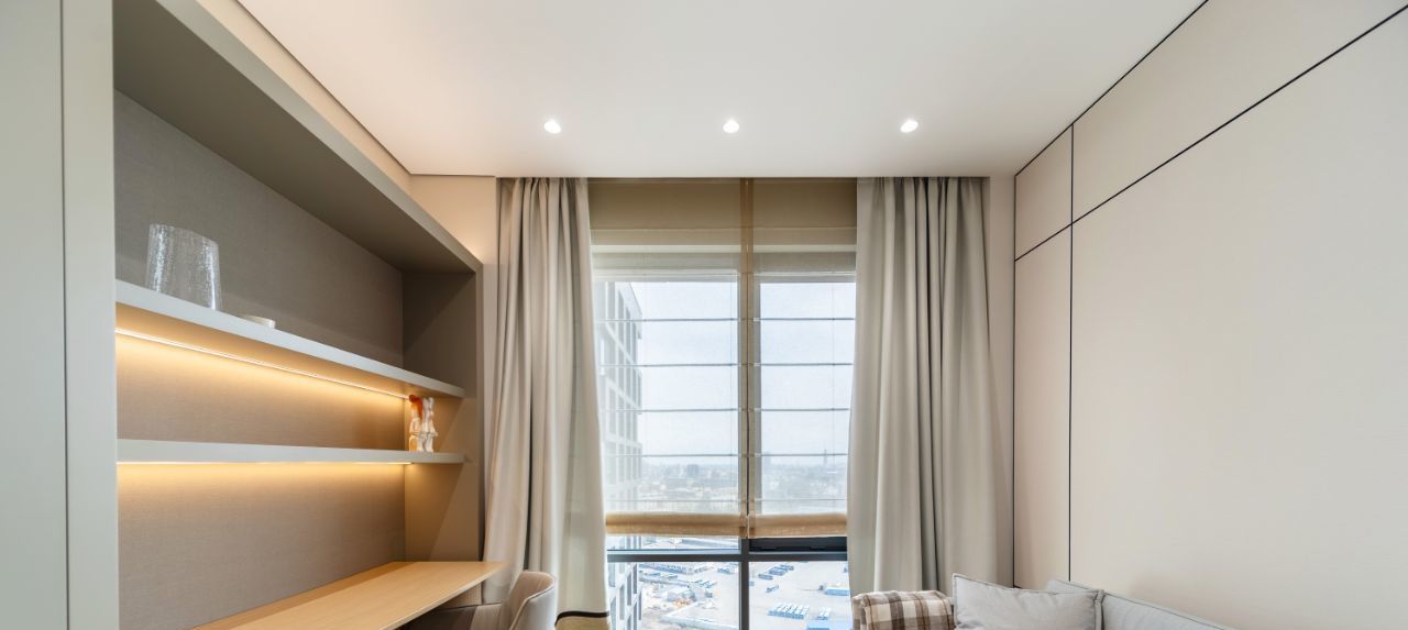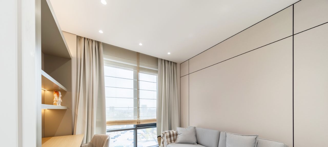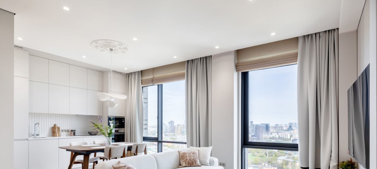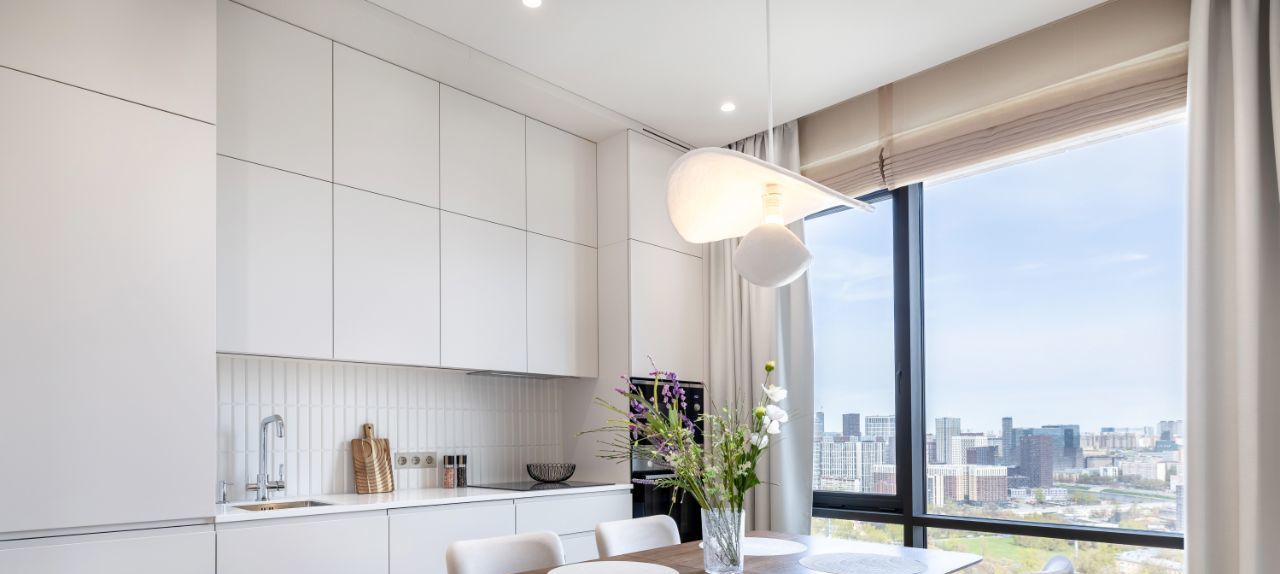 Панорамные окна наполняют пространство естественным светом и создают ощущение простора и уюта. Высокий этаж гарантирует приватность и впечатляющие виды в любое время суток.