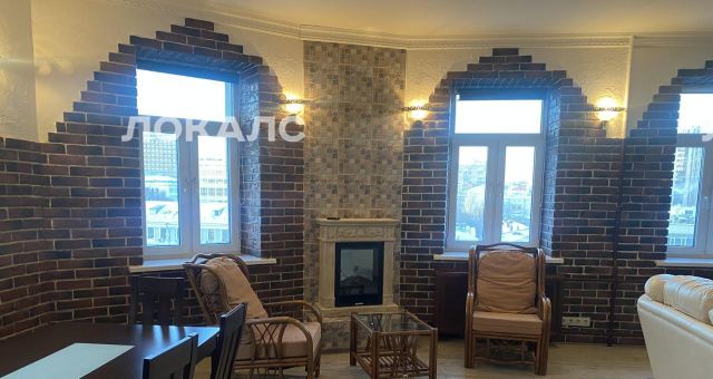 Большая гостиная в стиле ЛОФТ с камином, в которой приятно проводить время и отдыхать. Прекрасный вид на вечернюю Москву. 2 изолированные спальни. Гостиная с проходной комнатой отделена от зоны, где находятся спальни.