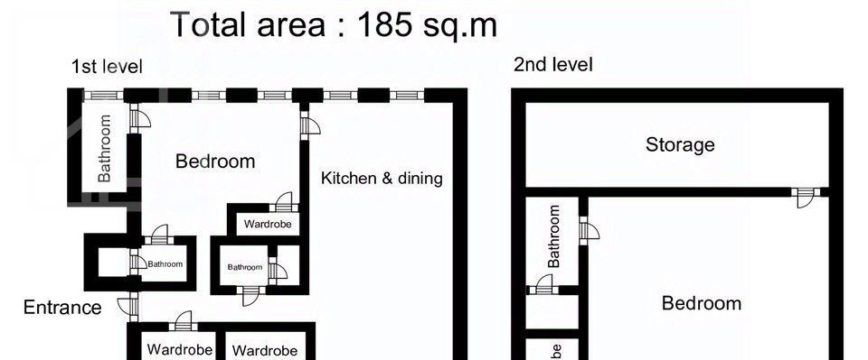 Планировка: 1-й уровень : кухня, совмещенная с гостиной и обеденной зоной, две спальни, два санузла, три гардеробные, большая гардеробная, прихожая;