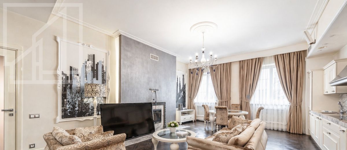 Планировка: гостиная с камином, кухня, две спальни, два санузла, гардеробная. Ремонт выполнен в уникальном авторском стиле. Потолки 3,2м. Окна выходят в тихий двор.
