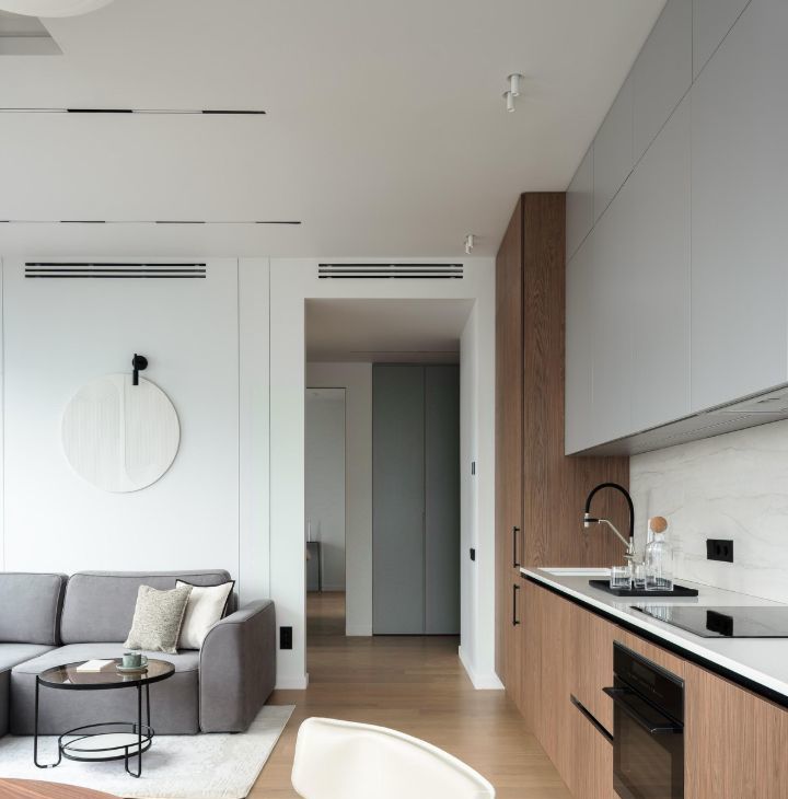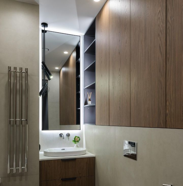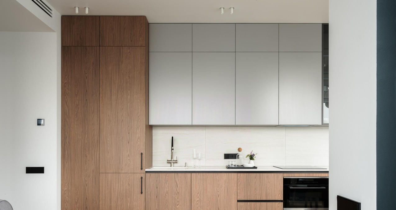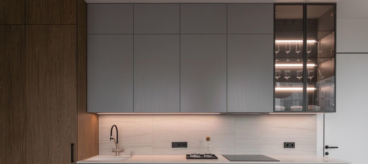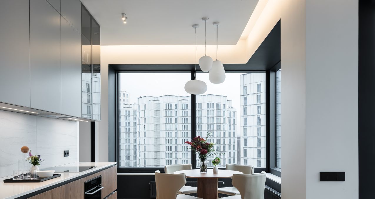В зоне кухни полный комплект высококачественной встроенной техники Kuppersberg, Bosch и Liebher, включая холодильник с морозильной камерой, большую посудомоечную машину, микроволновую печь совмещенную с духовым шкафом, индукционную варочную поверхность и вытяжку. Предусмотрены удобные места для хранения посуды и продуктов, а также элегантная обеденная зона с отдельным освещением.