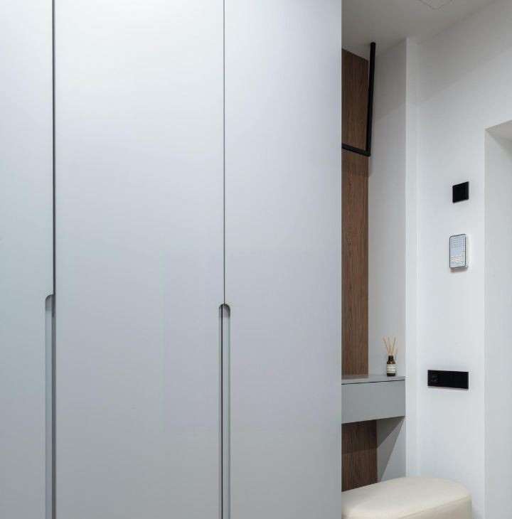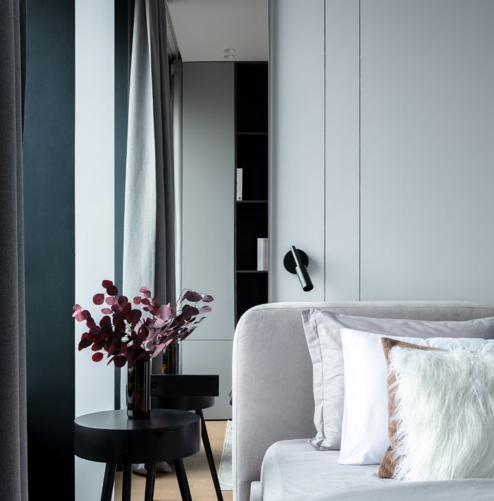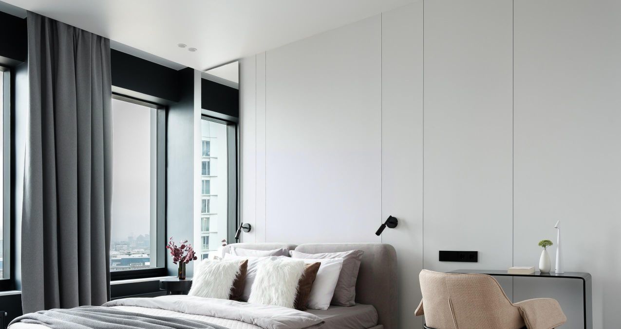 В спальне большая кровать 180*200 с качественным матрасом Askona и подъемным механизмом, а также вместительная гардеробная и санузел с ванной из литого мрамора.