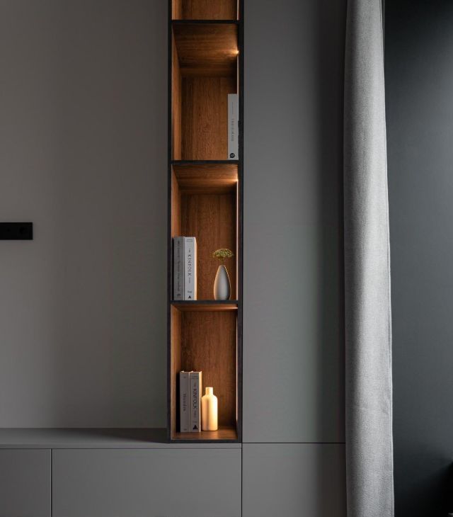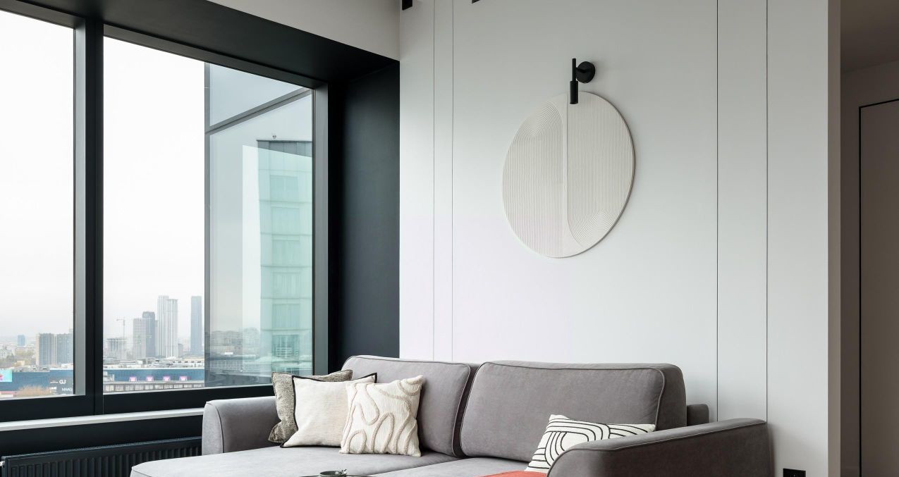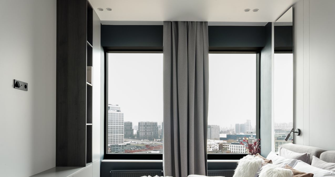 У панорамного окна расположена зона отдыха с раскладным диваном и зоной для телевизора.