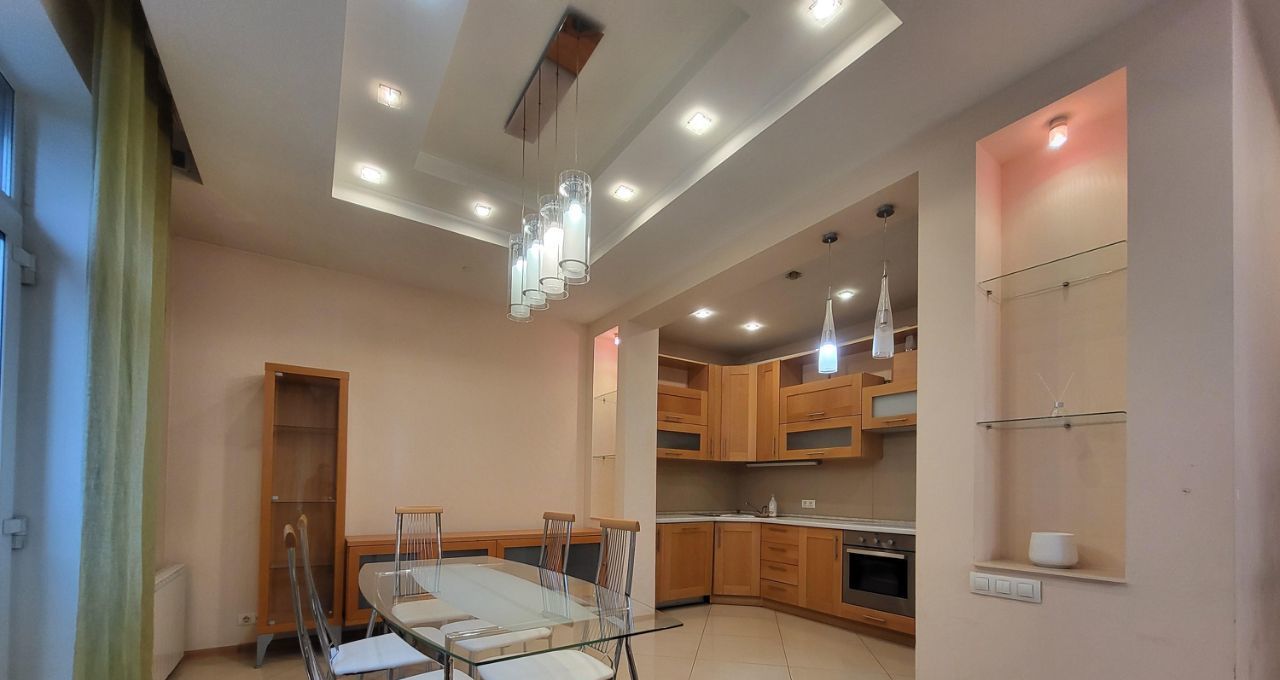 Удобная планировка: две спальни, кабинет, большая гостиная совмещена с кухней-столовой, два просторных санузла (душевая, ванна), две гардеробные комнаты (одна изолированная, другая проходная с полками и штангами для вешалок). При входе есть вместительный встроенный шкаф для одежды. Вся необходимая мебель и бытовая техника для комфортного проживания. В детской комнате новые кровати с матрасами.