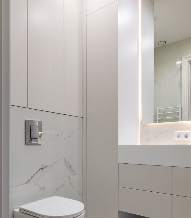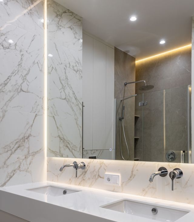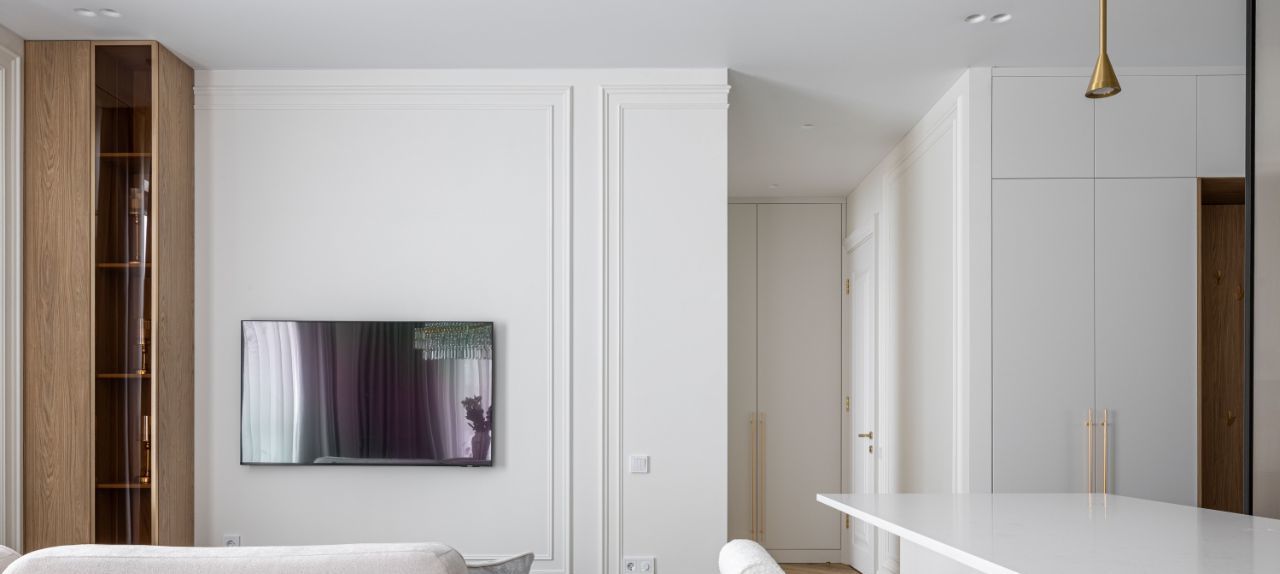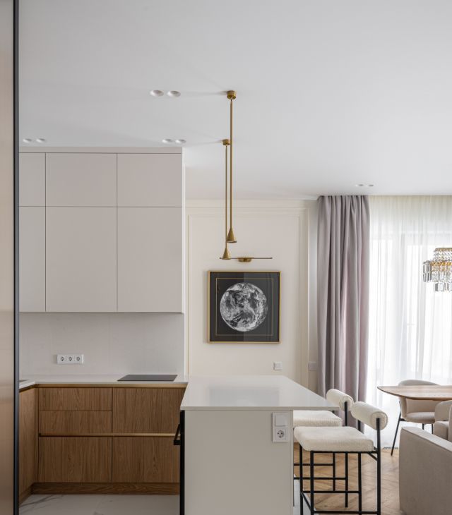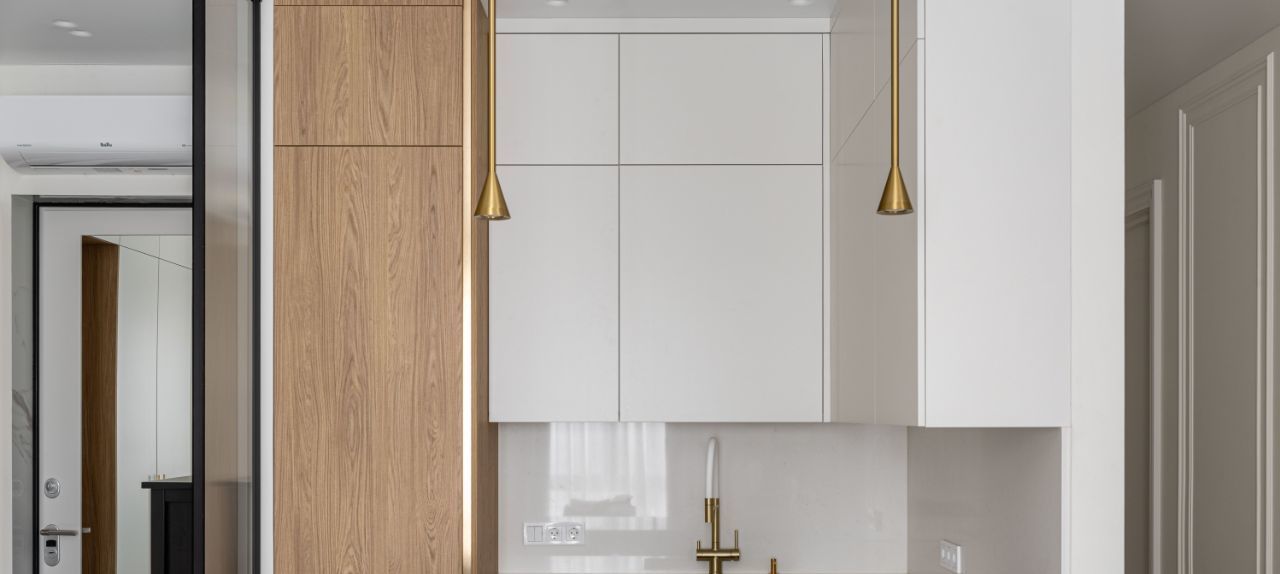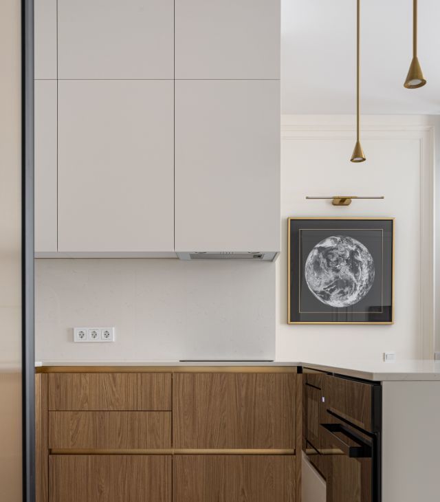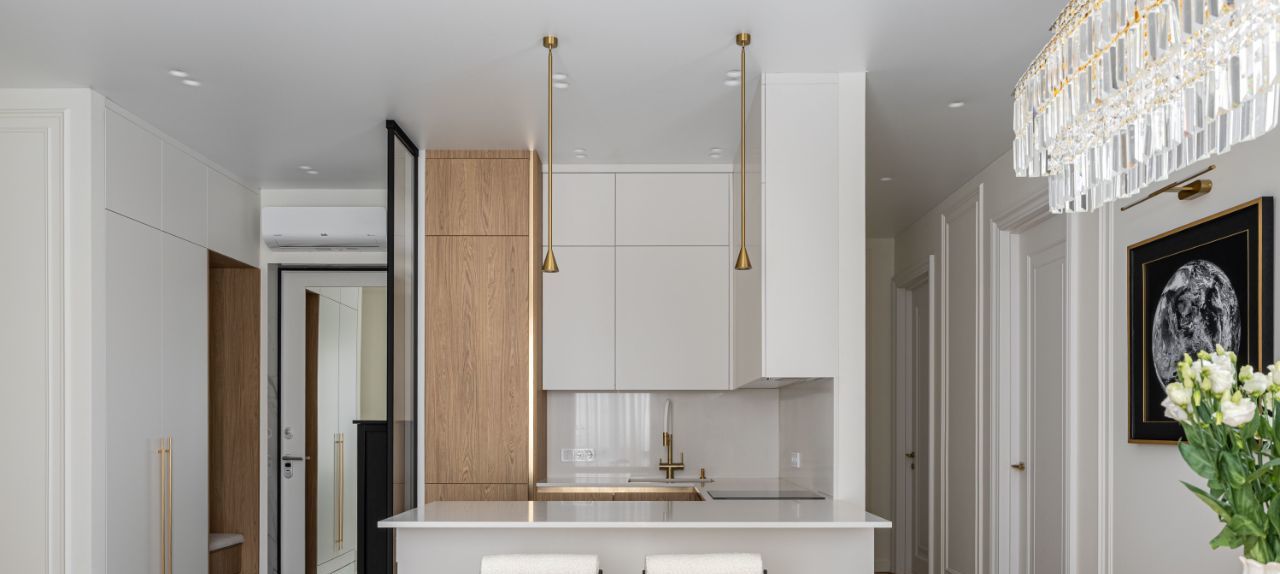 • индивидуальная кухня со встроенной подсветкой, фурнитурой Голла и доводчиками;