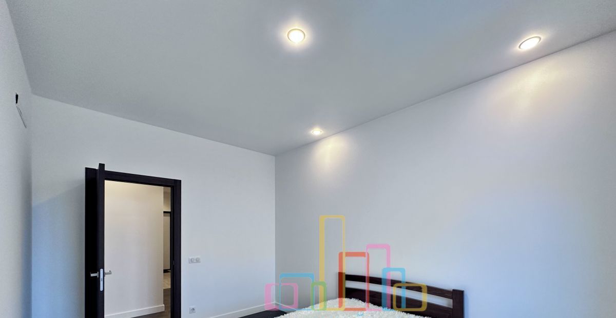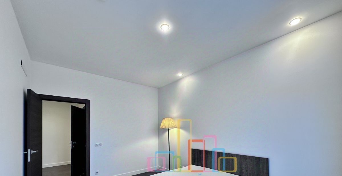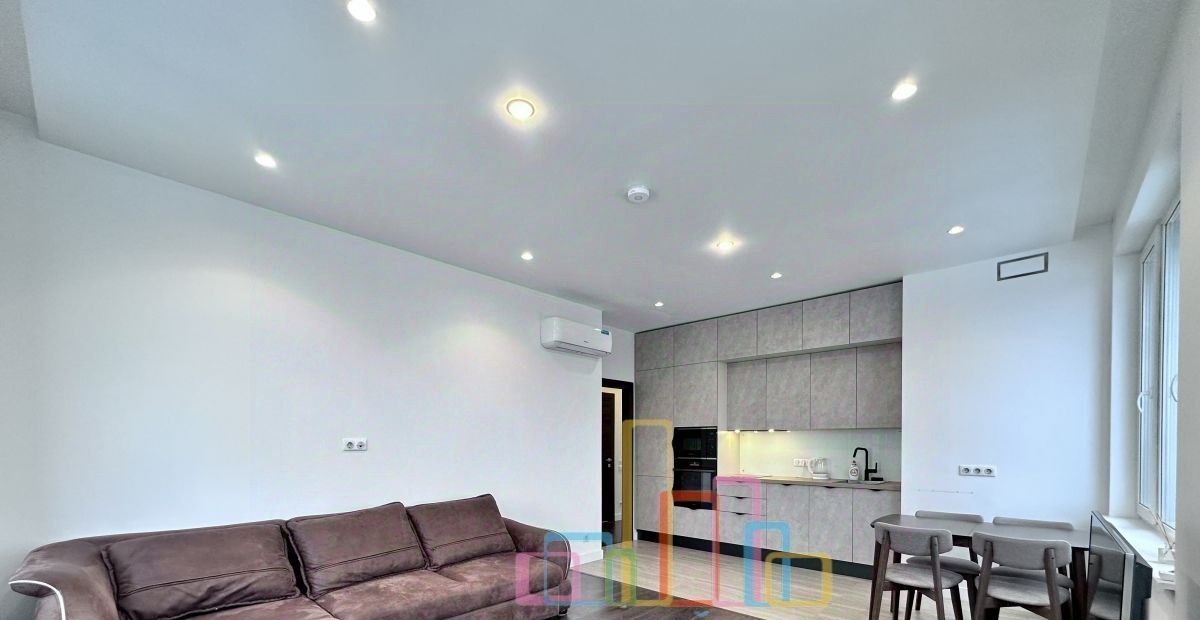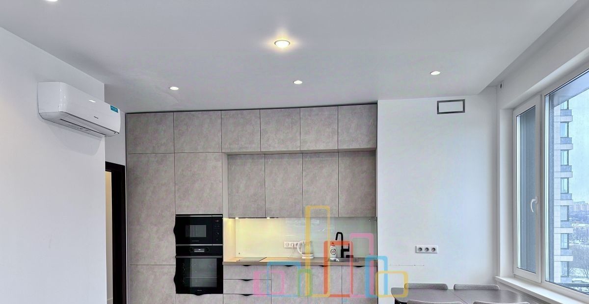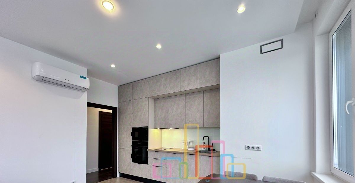 Квартира оснащена всей необходимой мебелью и бытовой техникой для комфортного проживания, включая посудомоечную машину и кондиционер.