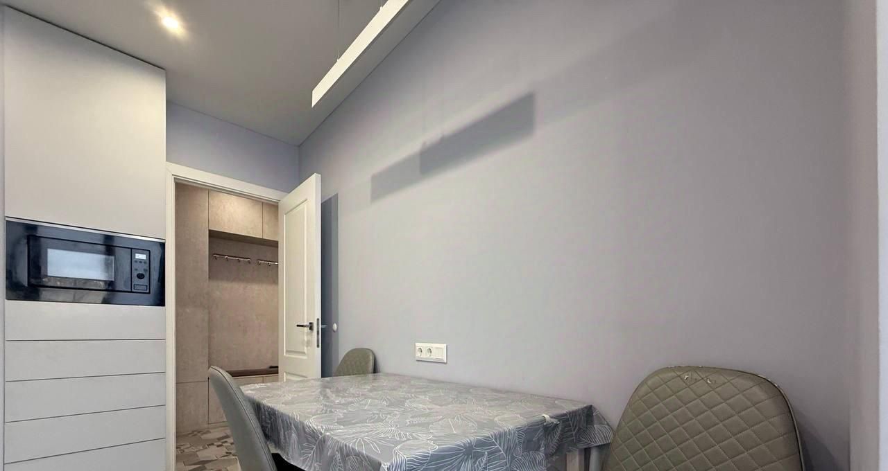 Кухня: оборудована всей встроенной техникой — духовка, микроволновая, варочная панель, вытяжка, холодильник.