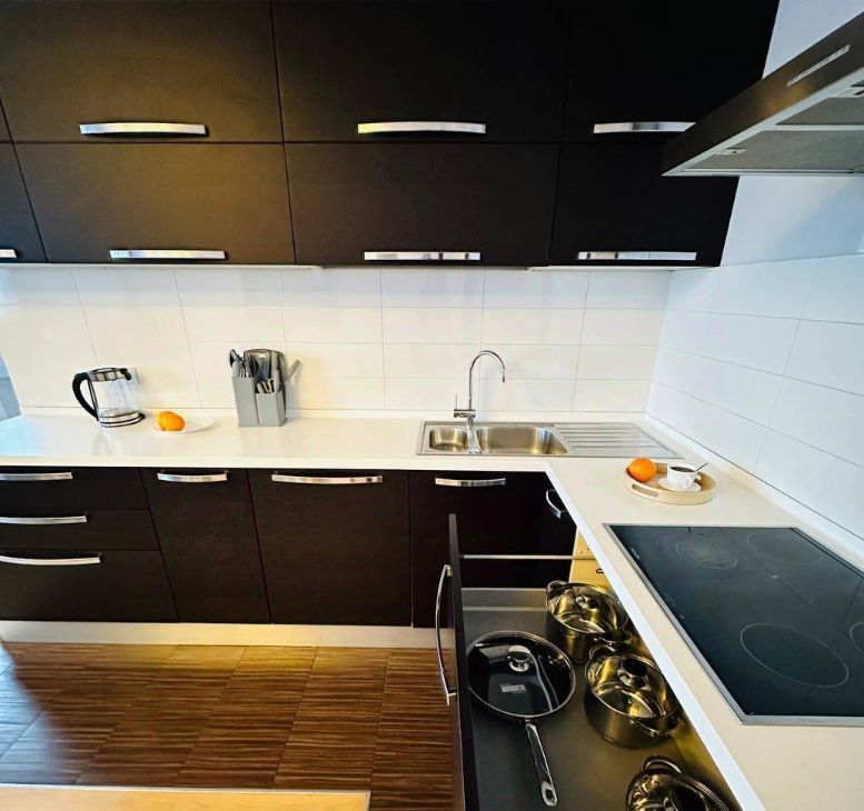 Встроенная кухня: холодильник, морозильная камера, варочная панель, вытяжка, духовой шкаф, СВЧ, стиральная машина.