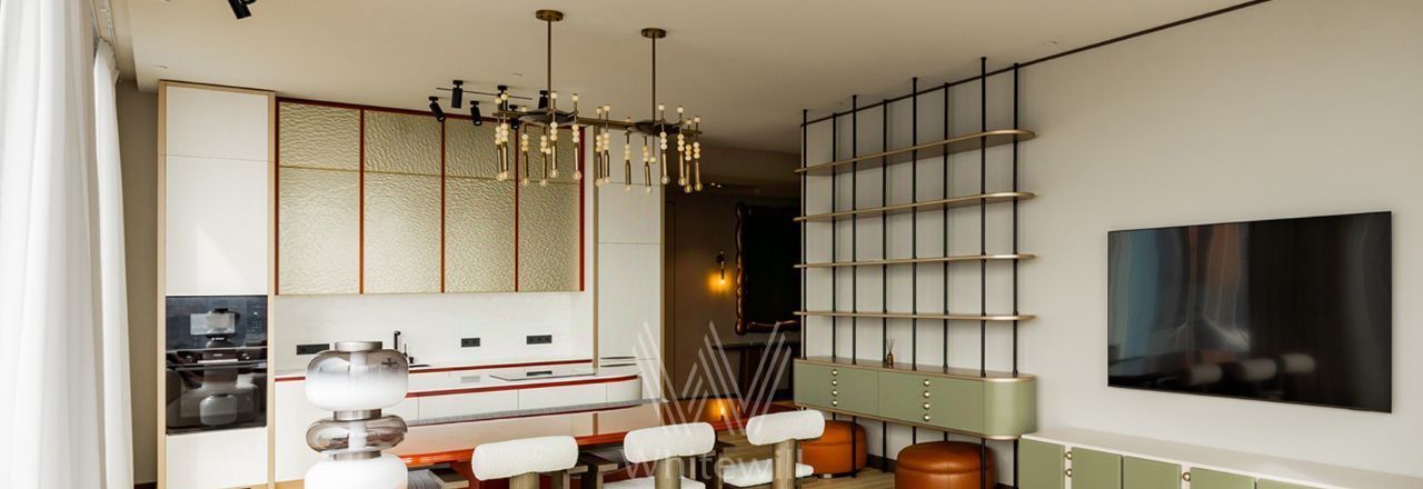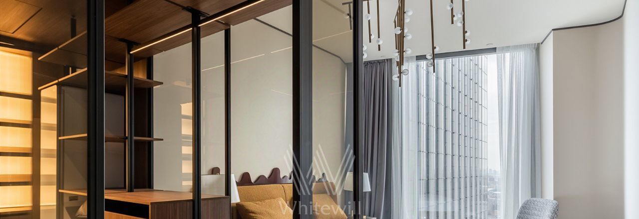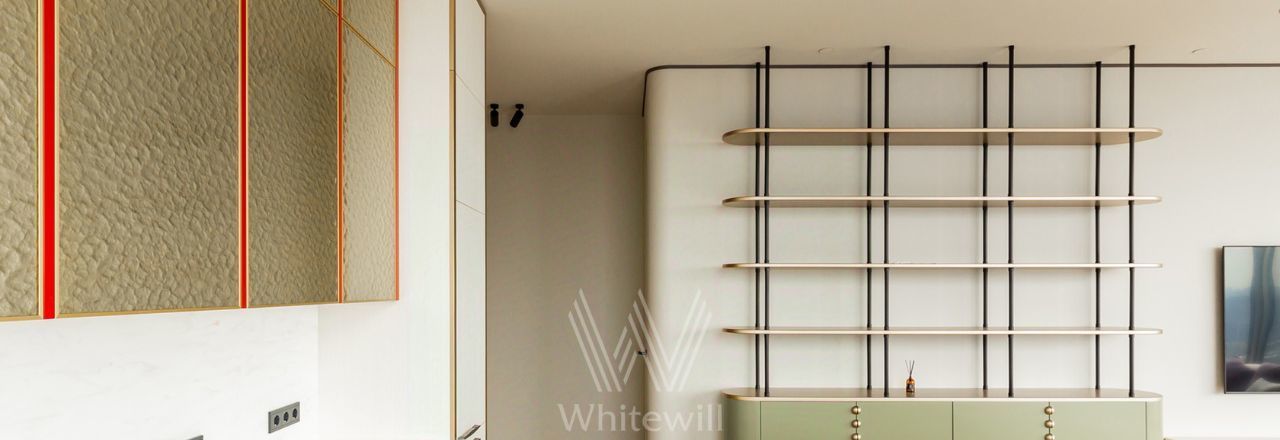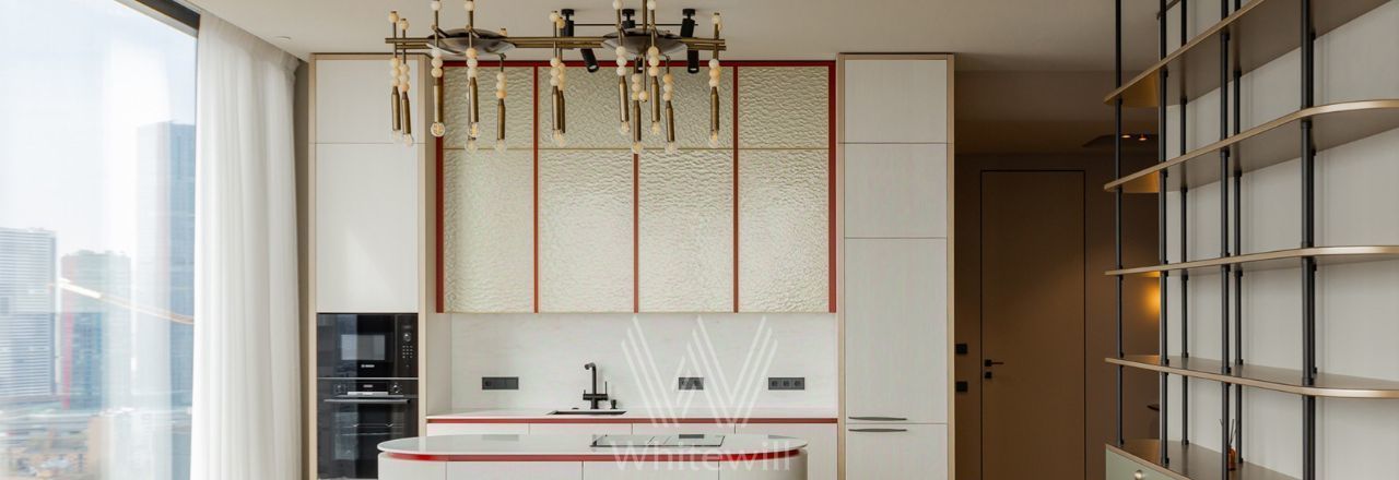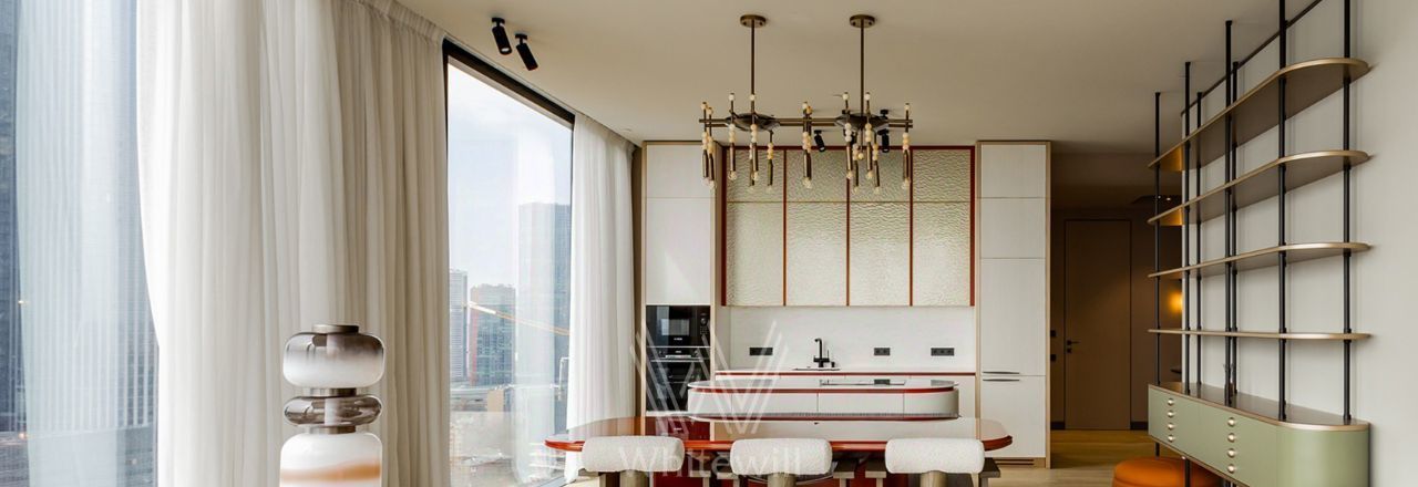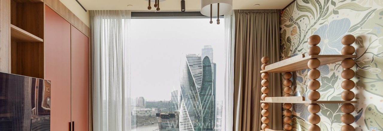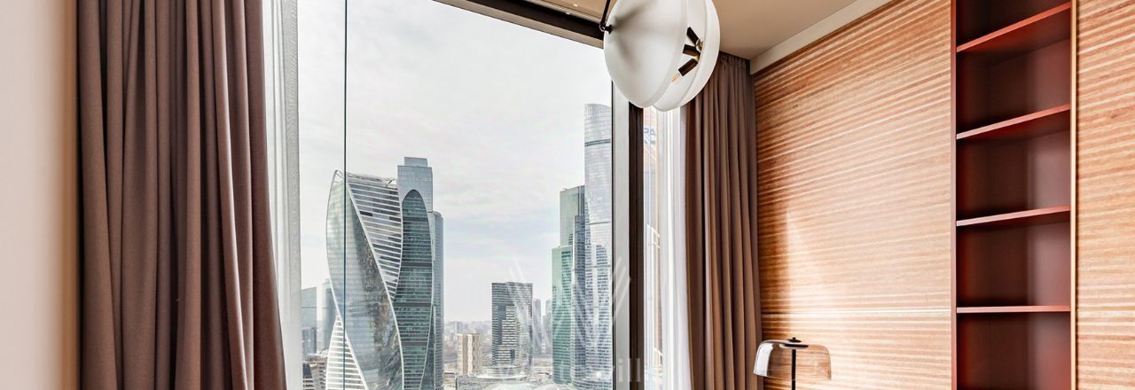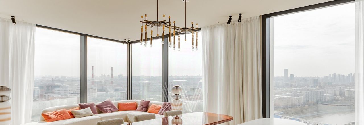 Просторная видовая квартира площадью 130 м² в комплексе небоскрёбов премиум-класса Capital Towers на берегу Москвы-реки. Интерьер оформлен в современном стиле в приятных светлых тонах с яркими акцентами. Панорамные окна в пол, высокие потолки, много естественного света. С высоты 26 этажа открываются завораживающие виды на башни, реку и Дом Правительства.