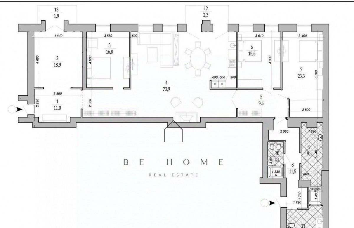 Планировка включает большую кухню-гостинную, 3 изолированные комнаты, две раздельные ванные комнаты и большую прачечную.