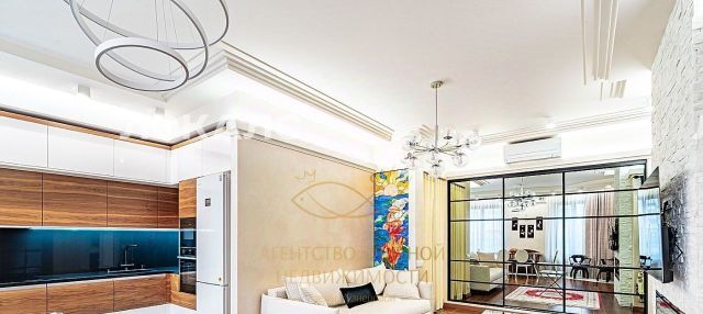 Просторная 4-комнатная квартира премиум-класса с функциональной планировкой: гостиная, объединенная с кухней, кабинет, две уютные спальни, гардеробная, два санузла и утепленная лоджия с лаунж-зоной. В квартире выполнен дизайнерский ремонт с использованием высококачественных материалов. Полы с подогревом, биокамин создают атмосферу уюта и комфорта.