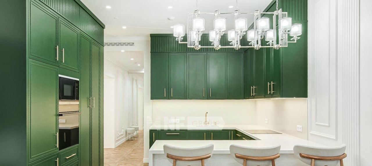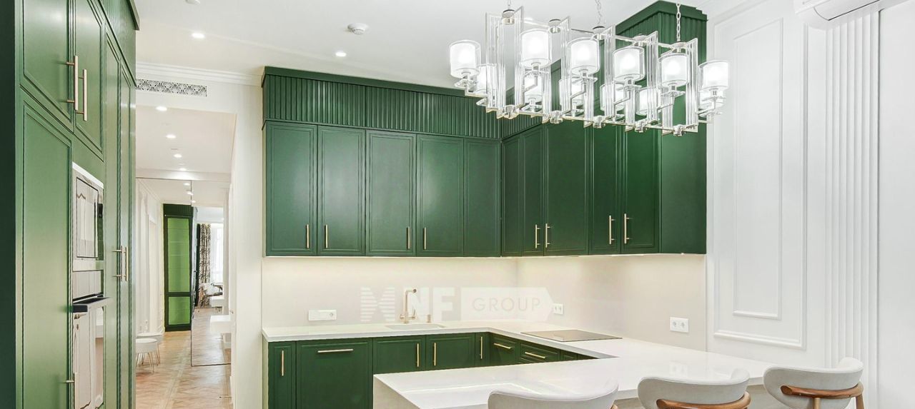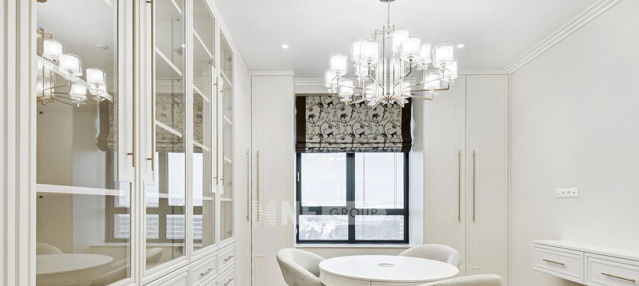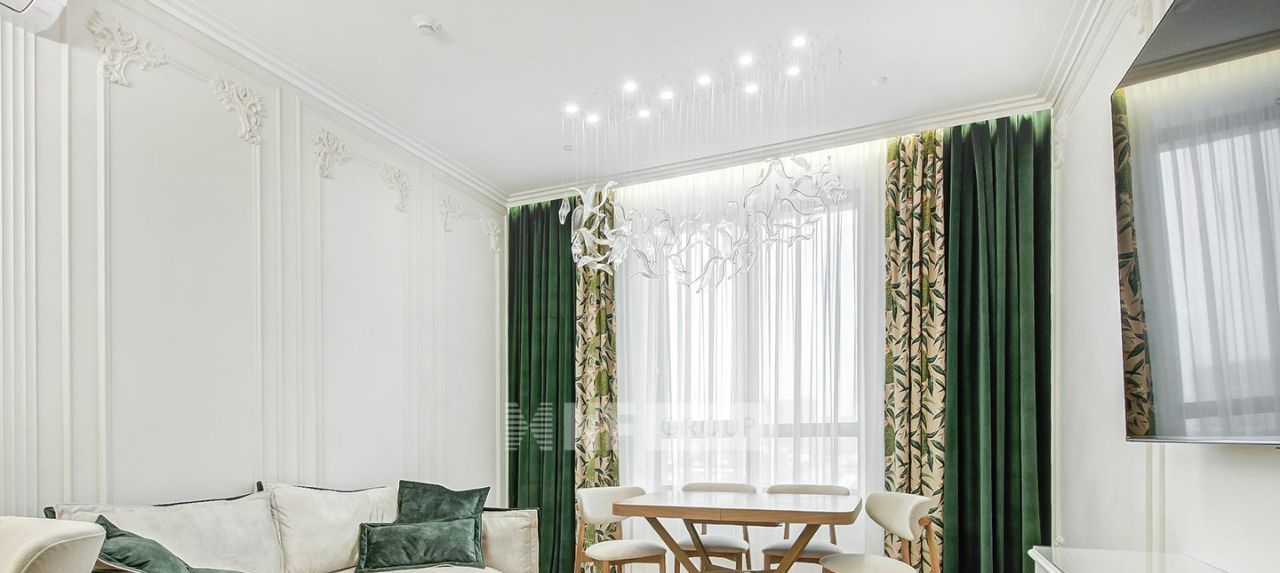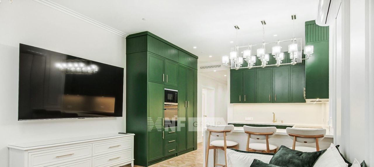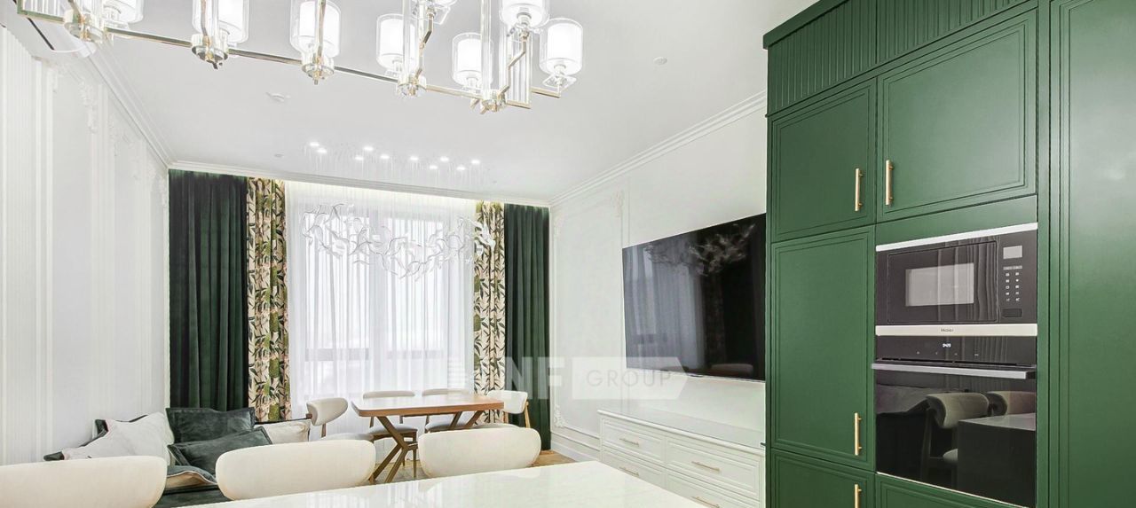 Выполнена отделка в классическом стиле (отделка новая, никто не проживал), апартамент меблирован и оснащен качественной бытовой техникой, системой очистки воздуха и воды, в каждой комнате теплые полы.