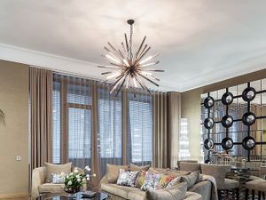 Бонус партнёрам 50%. Просторные апартаменты с 3-мя спальнями площадью 176 м² находятся на 12 этаже в комплексе премиум-класса "ВТБ Арена Парк". Внутри выполнен авторский ремонт в стиле современной классики. Интерьер оформлен в теплых тонах, украшен дизайнерскими итальянскими люстрами и подсветкой потолков. В отделке использованы натуральные материалы — дикий шелк на стенах, стол из камня. В апартаментах проведена система кондиционирования с функцией очистки воздуха с дополнительными фильтрами.