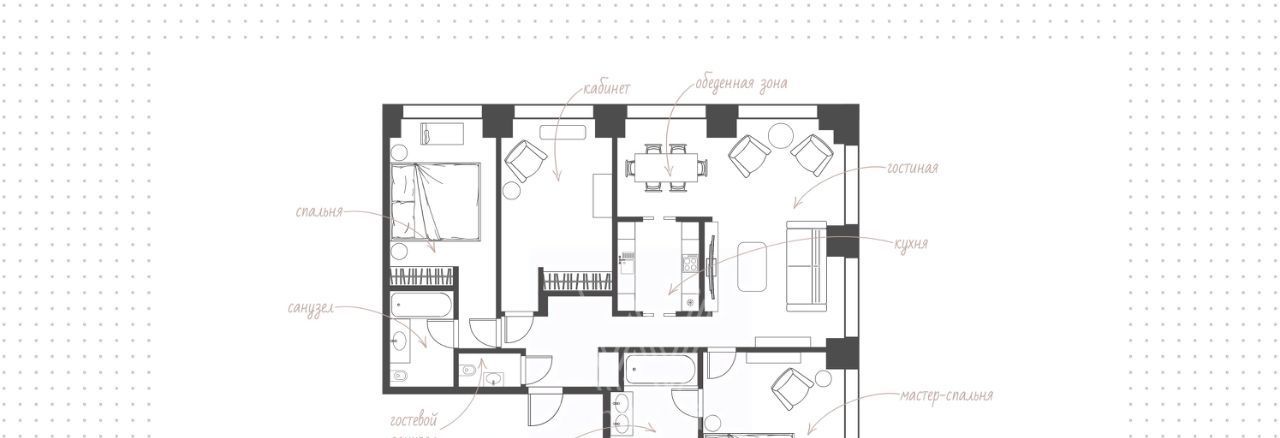 Спланирована угловая гостиная с 4 окнами и обеденной зоной, кухня, мастер-спальня со своей гардеробной и ванной комнатой, вторая спальня со своей ванной комнатой, комната свободного назначения, гостевой санузел, холл. Квартира полностью меблирована и укомплектована техникой. Установлена система кондиционирования, стиральная и посудомоечная машины. Из окон открывается вид на город и территорию комплекса.