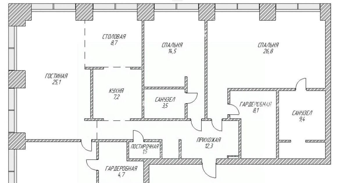 Спланированы кухня-гостиная, две мастер-спальни с ванными комнатами и гардеробными, спальня с санузлом, постирочная, холл.