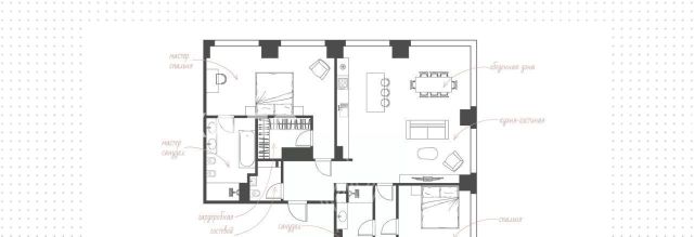Спланирована кухня-гостиная с угловым остеклением, мастер-спальня с собственной гардеробной и ванной комнатой, вторая спальня со своей гардеробной, третья спальня, ванная комната с душем, гостевой санузел, прихожая. Благодаря панорамному остеклению и потолкам высотой 3,1 метра пространство наполнено воздухом и естественным светом. Из окон открывается вид на внутренний двор-парк.