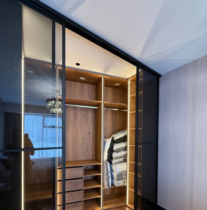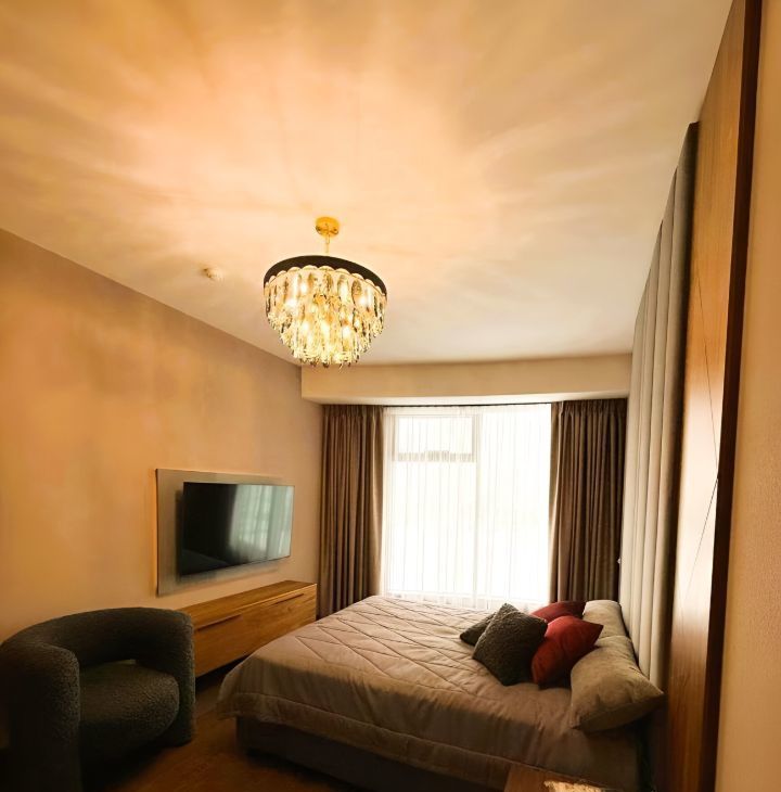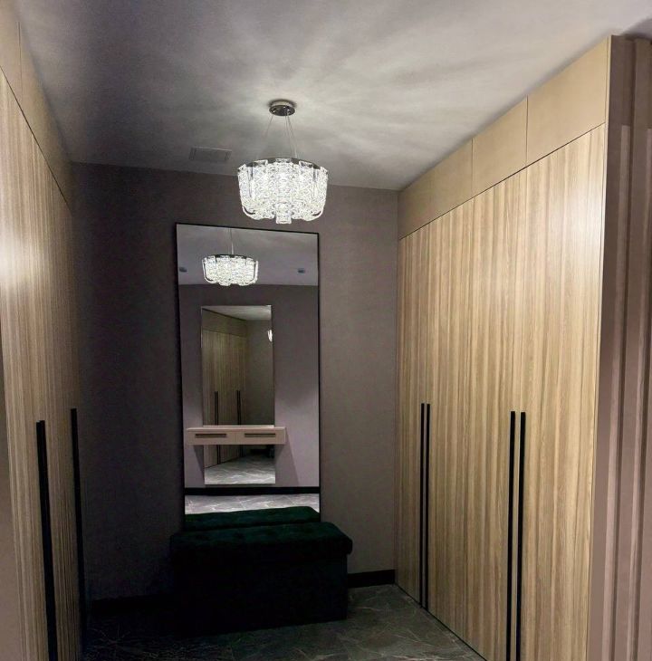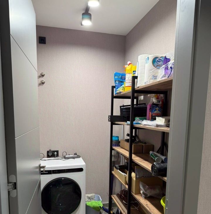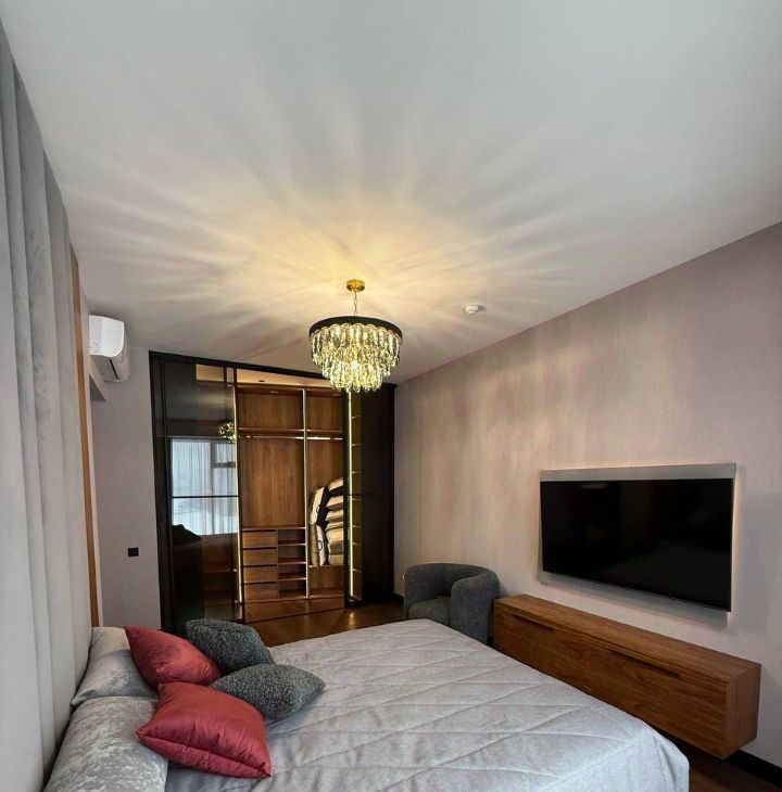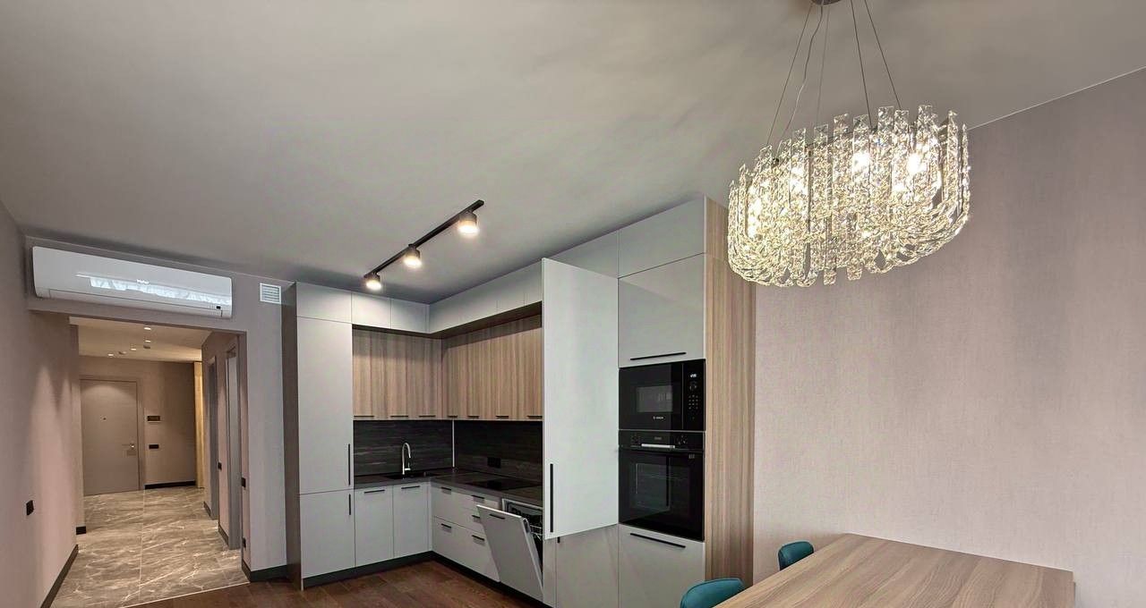 Квартира полностью меблирована и оснащена необходимой техникой, в гостиной установлен винный шкаф.