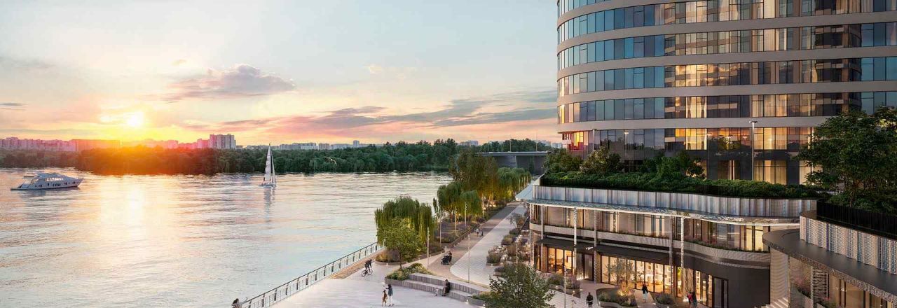Комплекс 2023 года постройки, расположен на береговой линии Москвы-реки, полностью закрытая территория, видеонаблюдение, охрана, собственная набережная с ландшафтным парком, зоной отдыха, кафе, магазинами (в т.ч. Вкус Вилл, Перекресток), амфитеатром, велосипедными дорожками и причалом для яхт. Для выгула собак - отдельная площадка. В комплексе предусмотрены кладовки, колясочные, лапомойка для питомцев на -1 этаже.