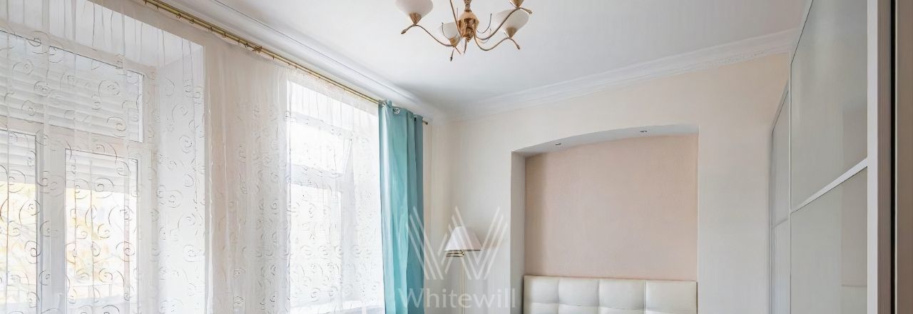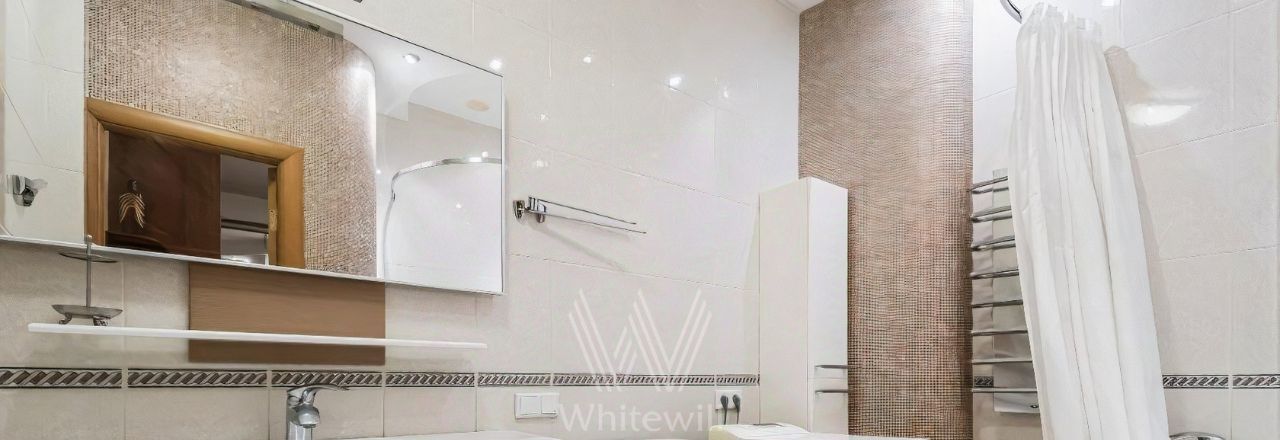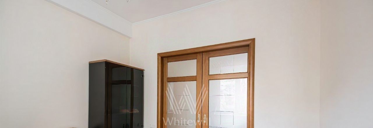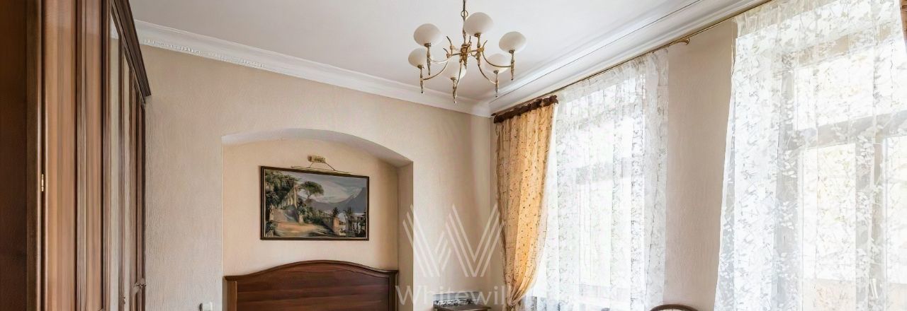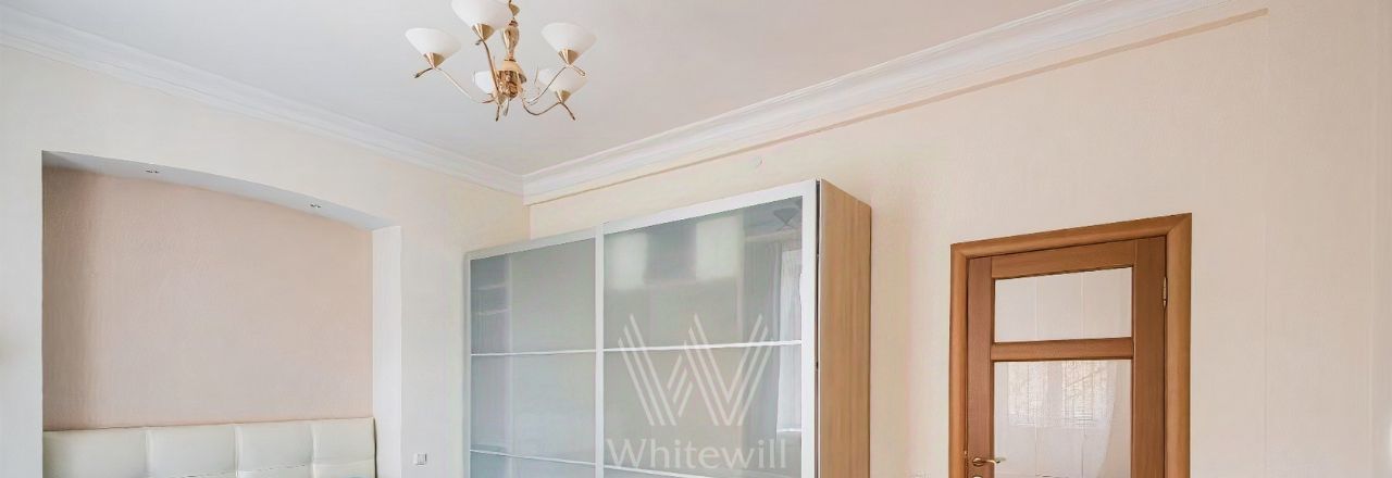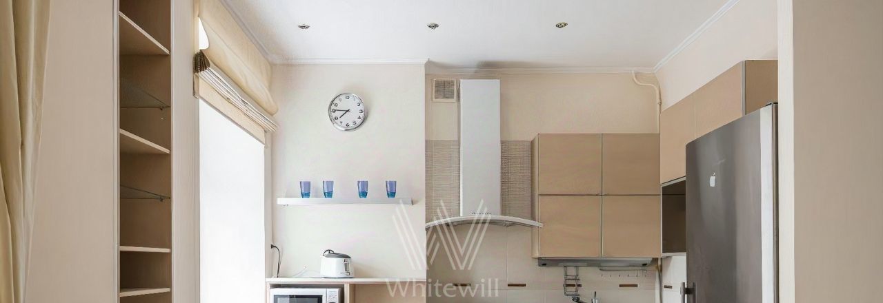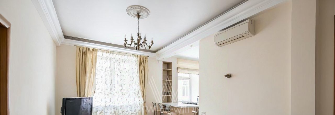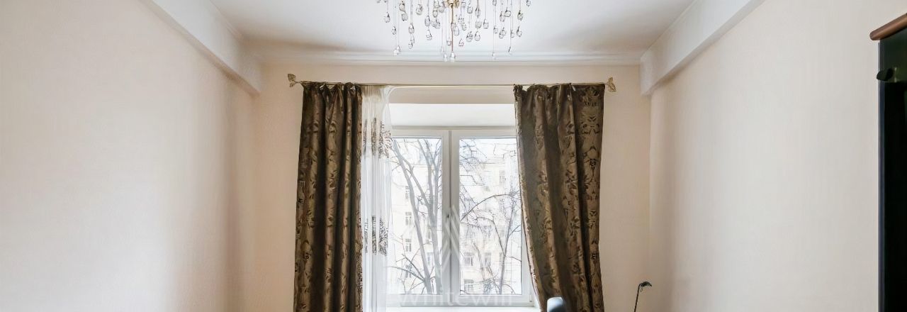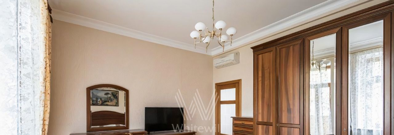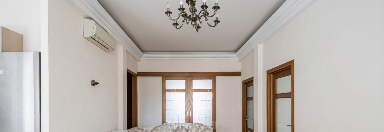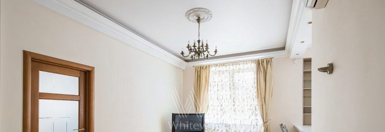 Квартира с 2-мя спальнями общей площадью 100 м² в доме напротив Патриаршего пруда. Выполнен светлый ремонт в стиле современной классики. В отделке использовано натуральное дерево. Квартира полностью с мебелью и бытовой техникой, кухня зонирована обеденным столом на 6 персон. Высота потолков 3,2 метра.