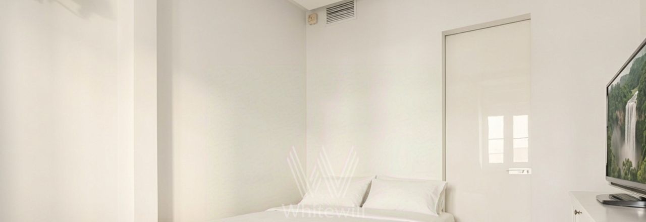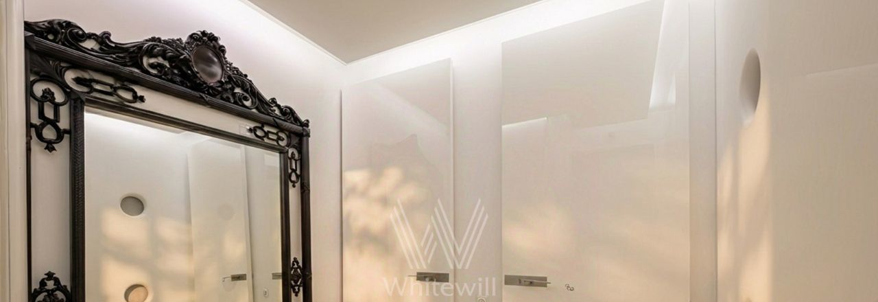 Светлая квартира с 3 спальнями общей площадью 104 м² в "Доме Фалеевых" на Лубянке в самом центре Москвы. Интерьер оформлен в стиле современного минимализма. Спланирована кухня-гостиная с выходом на балкон, мастер-спальня со своей ванной комнатой и выходом на балкон, вторая спальня, кабинет, гардеробная, второй санузел с душем, постирочная, балкон. Высота потолков 3 метра. Квартира укомплектована мебелью и бытовой техникой Kuppersbusch, Schulthess Maschinen AG, гардеробная система премиум-класса Molteni&C. Вся сантехника представлена брендом Flaminia. Установлена система кондиционирования, стиральная и посудомоечная машины, подогрев полов. Из окон открывается вид во двор.